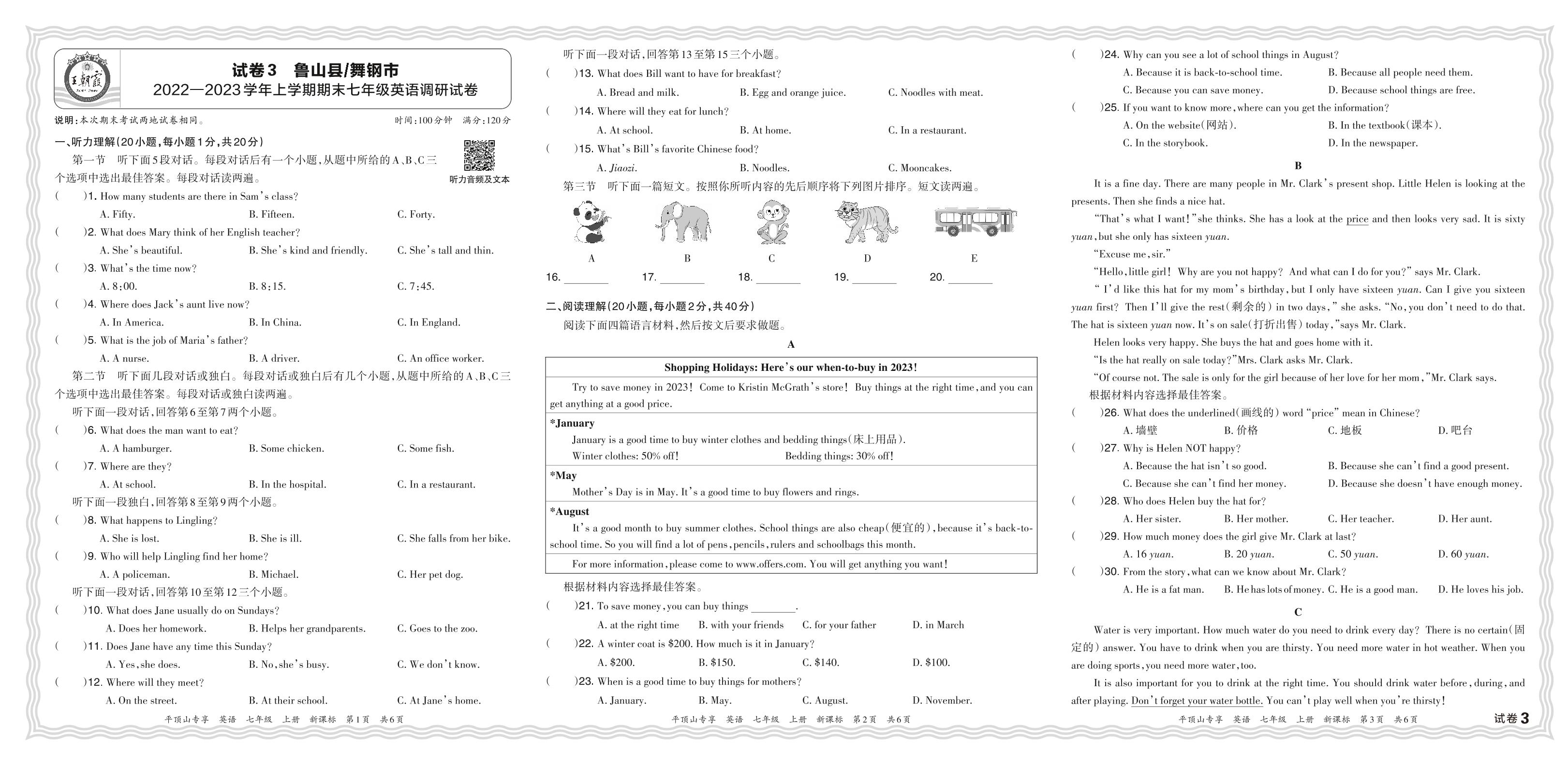 河南省平顶山市鲁山县、舞钢市2022—2023学年上学期期末七年级英语调研试卷(新课标版)【3】