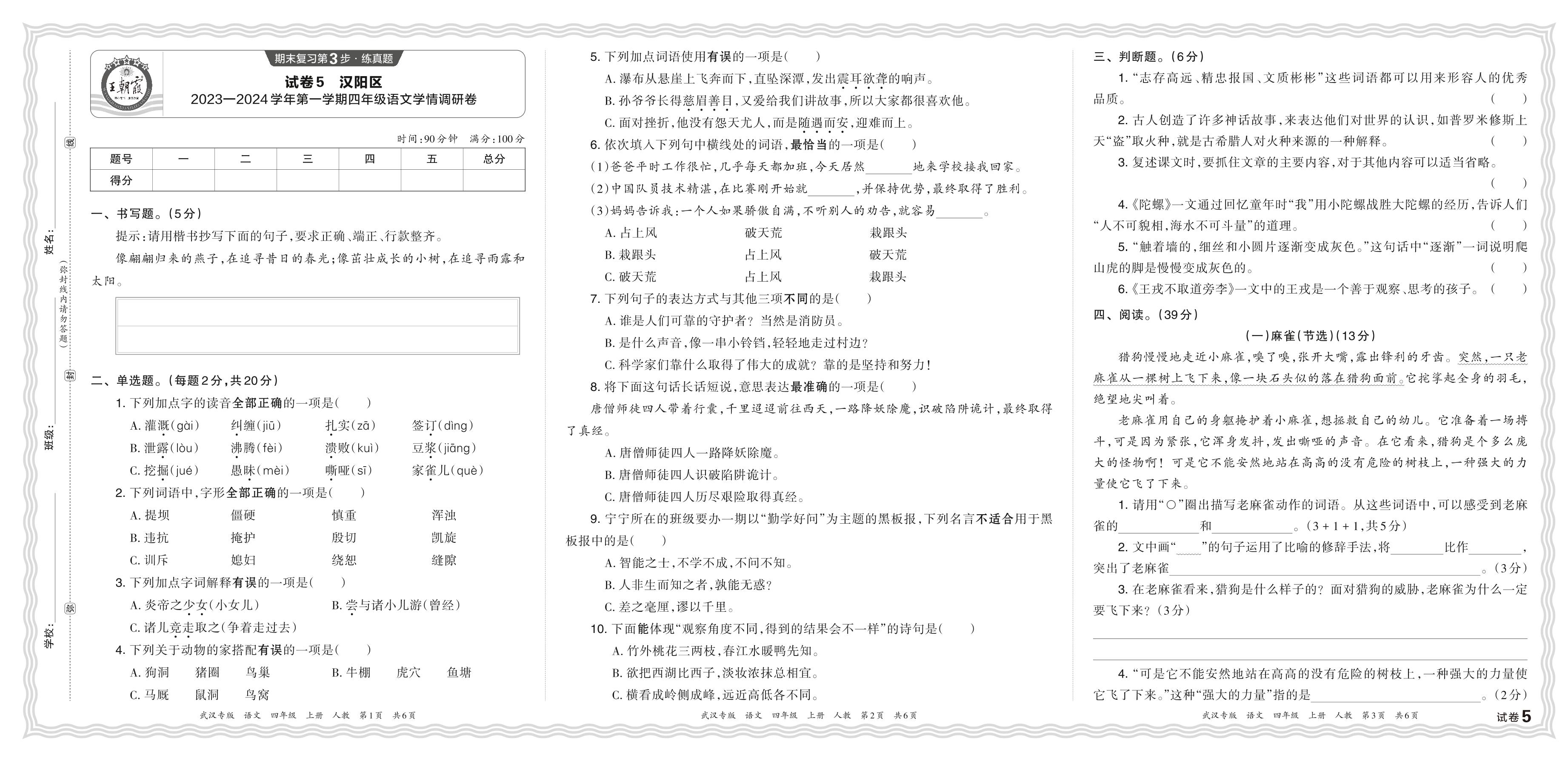 湖北省武汉市汉阳区2023—2024学年第一学期四年级语文学情调研卷(人教版)【5】