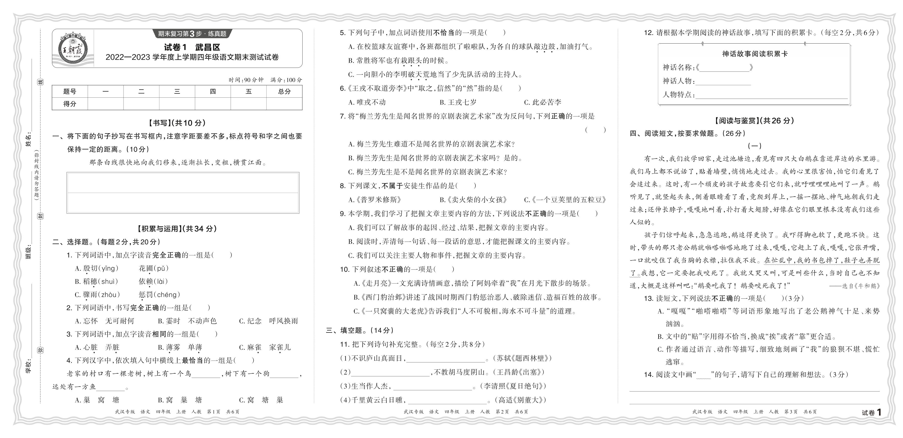 湖北省武汉市武昌区2022—2023 学年度上学期四年级语文期末测试试卷(人教版)【1】