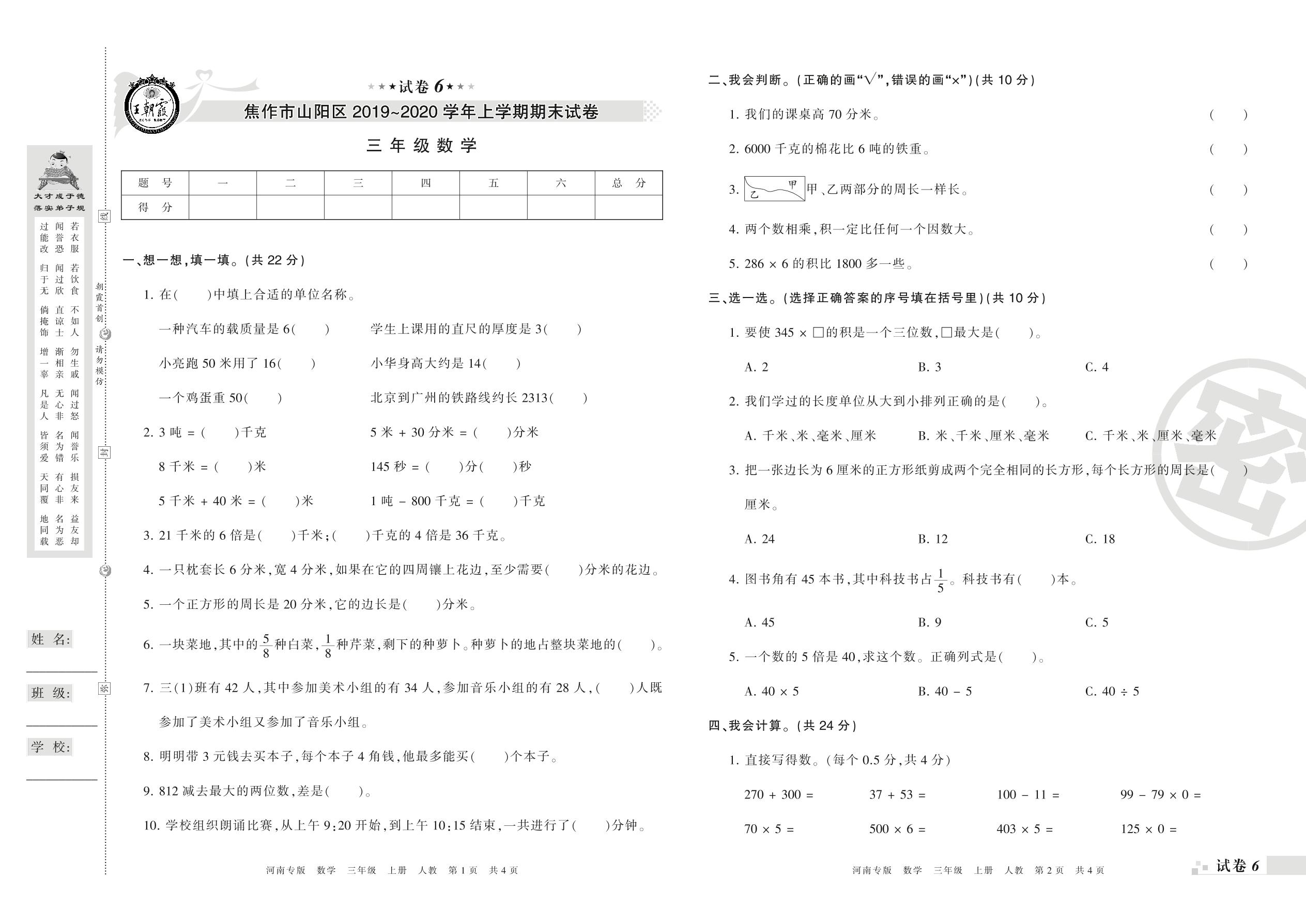 2019-2020学年第一学期焦作市山阳区三年级数学试卷(人教版)【6】