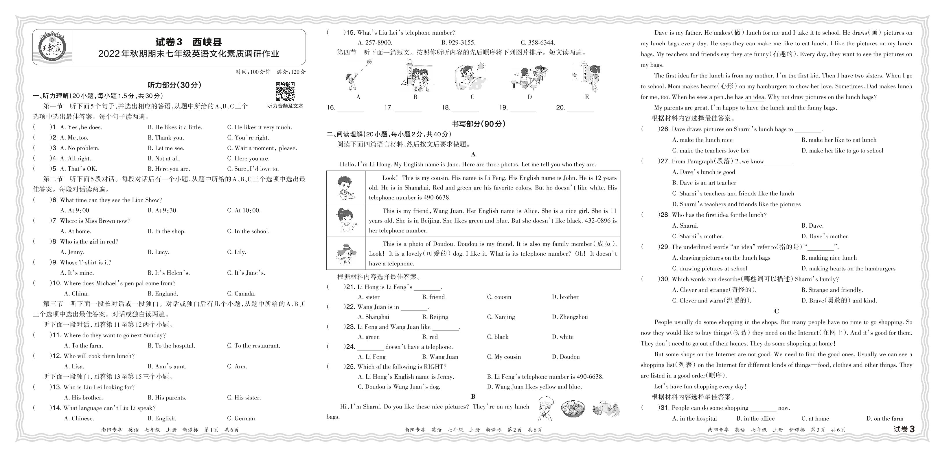 河南省南阳市西峡县2022年秋期期末七年级英语文化素质调研作业(新课标版)【3】