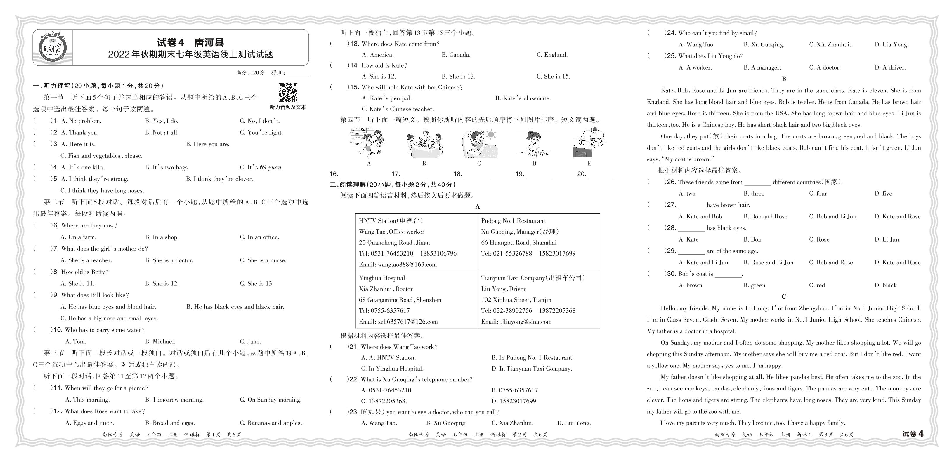 河南省南阳市唐河县2022年秋期期末七年级英语线上测试试题(新课标版)【4】
