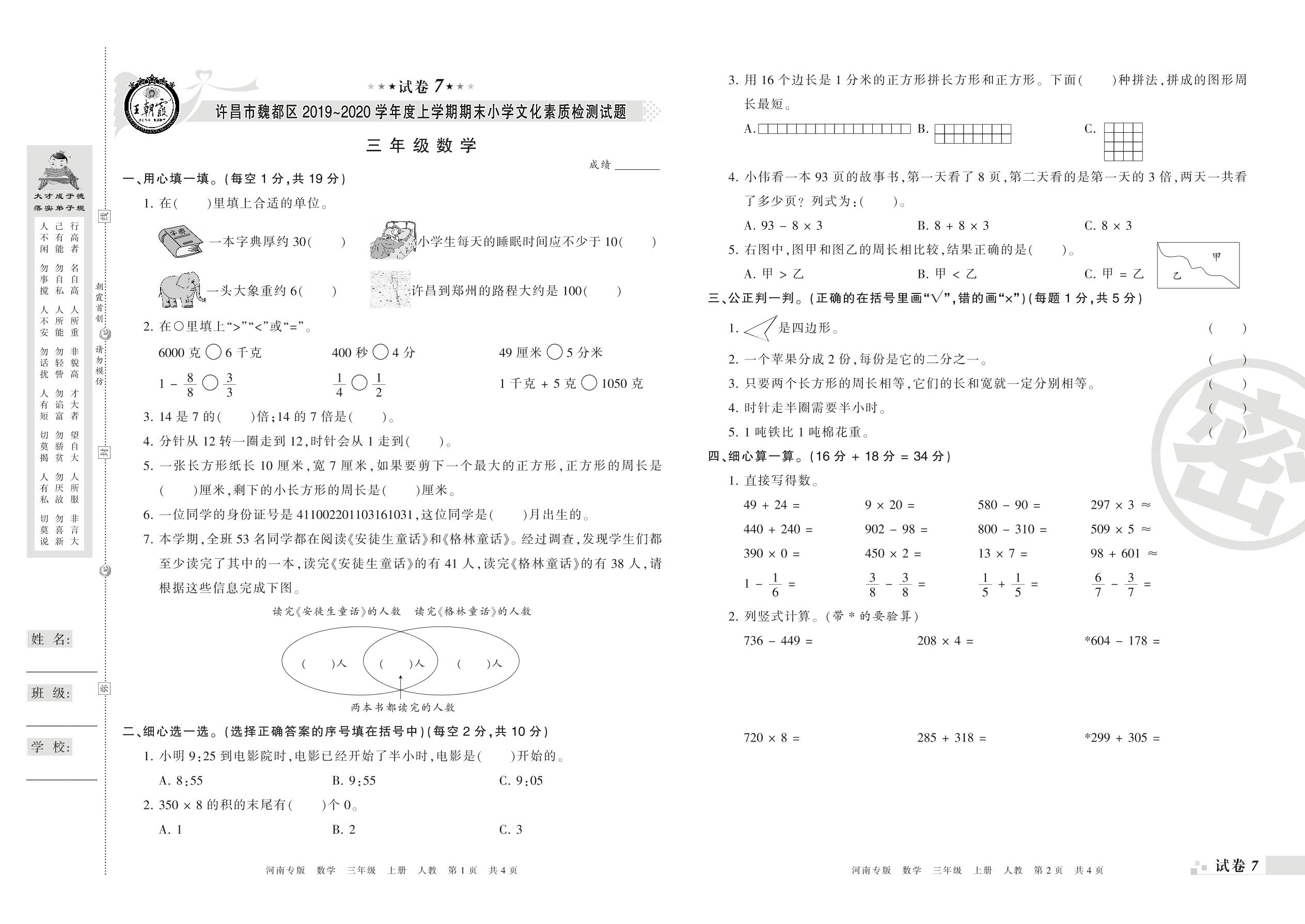 2019-2020学年第一学期许昌市魏都区三年级数学试卷(人教版)【7】