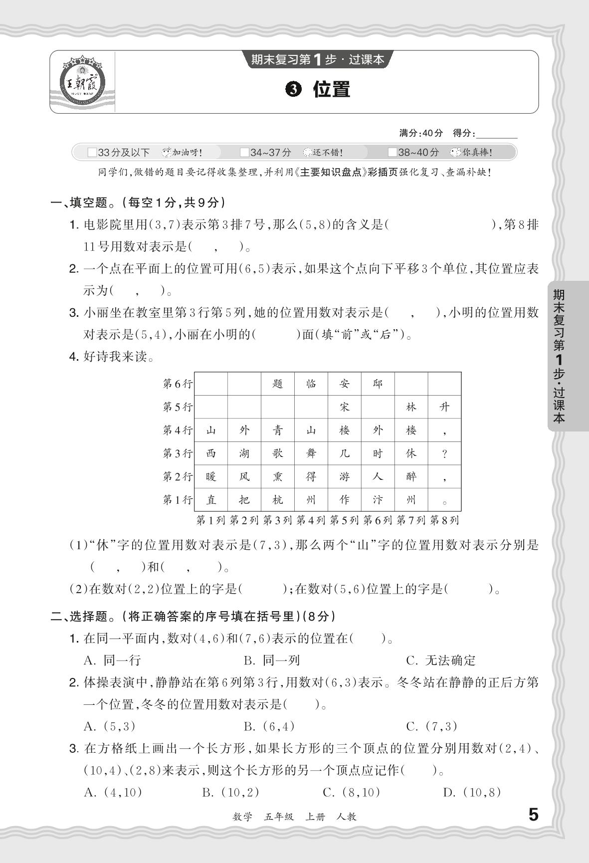 2023秋上册五年级数学人教版 期末过课本QMB版·位置【3】