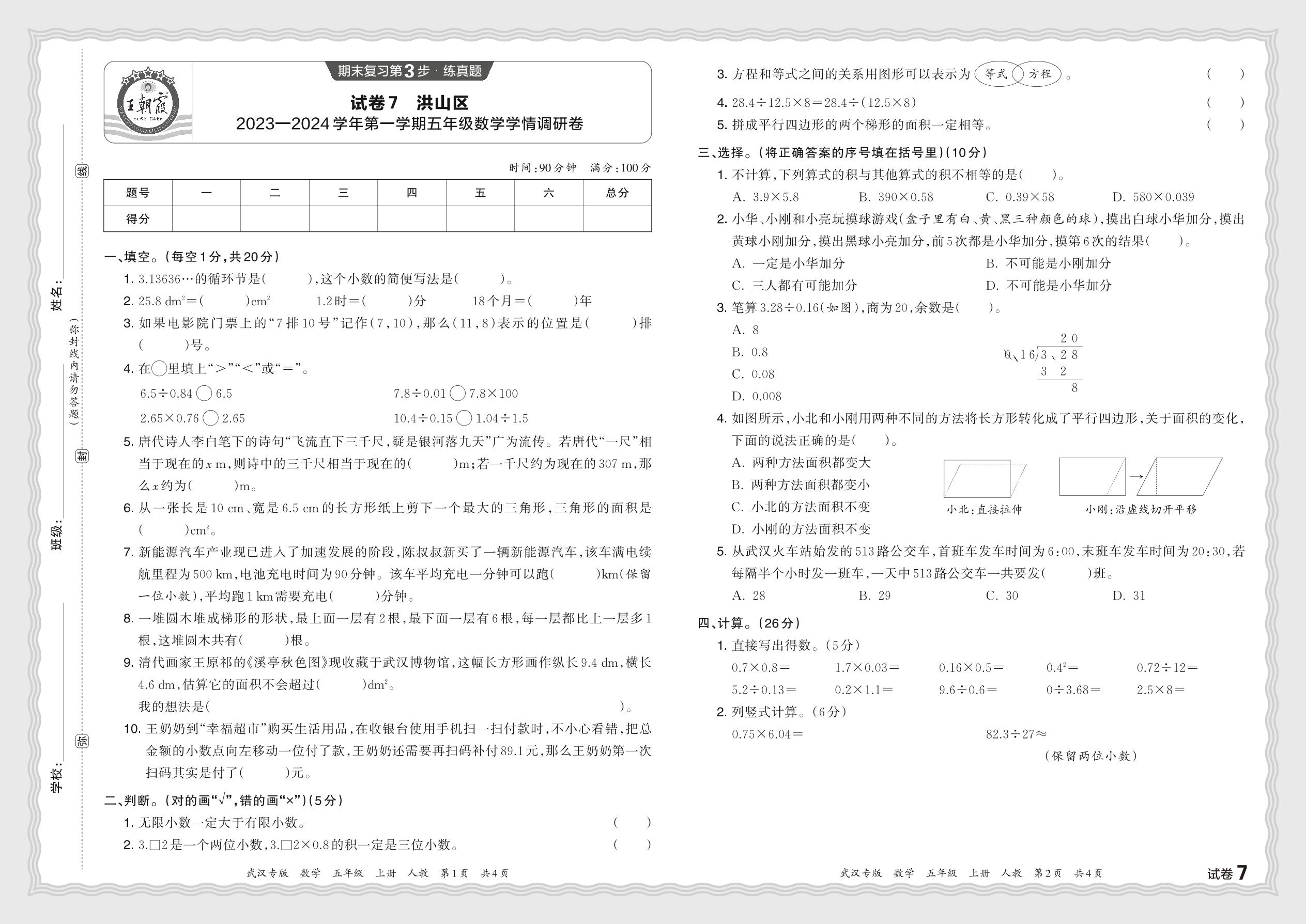 湖北省武汉市洪山区2023—2024学年第一学期五年级数学学情调研卷(人教版)【7】