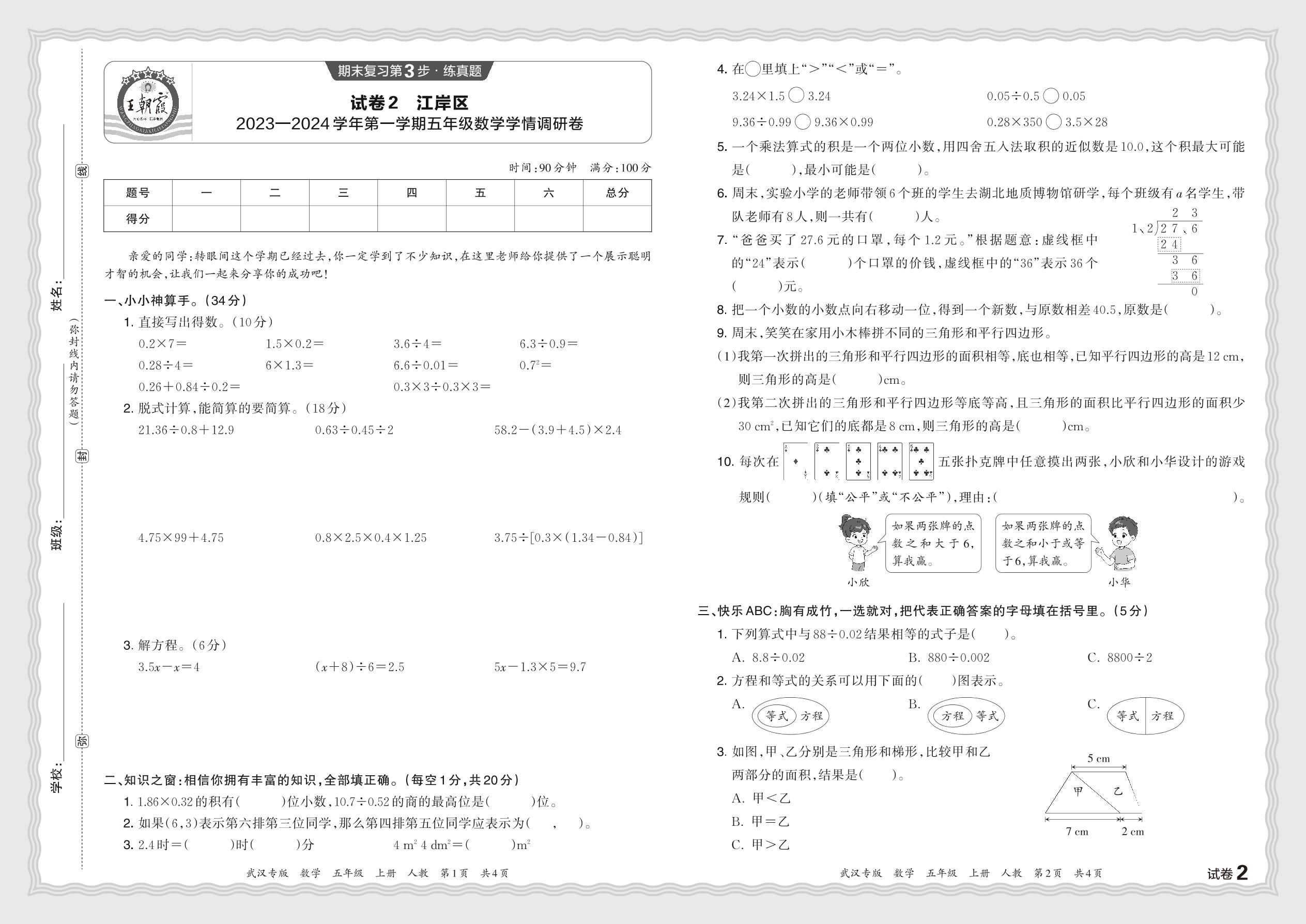 湖北省武汉市江岸区2023—2024学年第一学期五年级数学学情调研卷(人教版)【2】