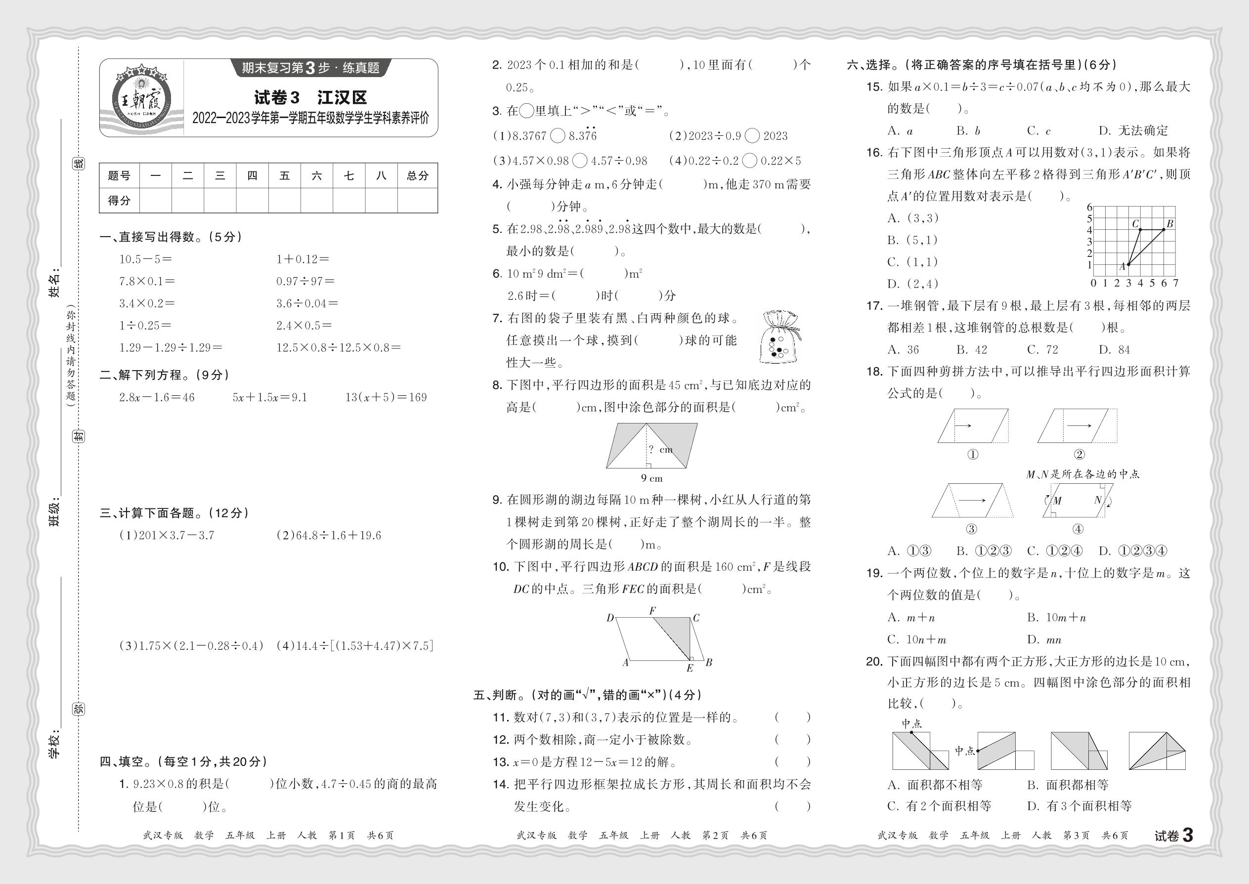 湖北省武汉市江汉区2022—2023学年第一学期五年级数学学生学科素养评价(人教版)【3】
