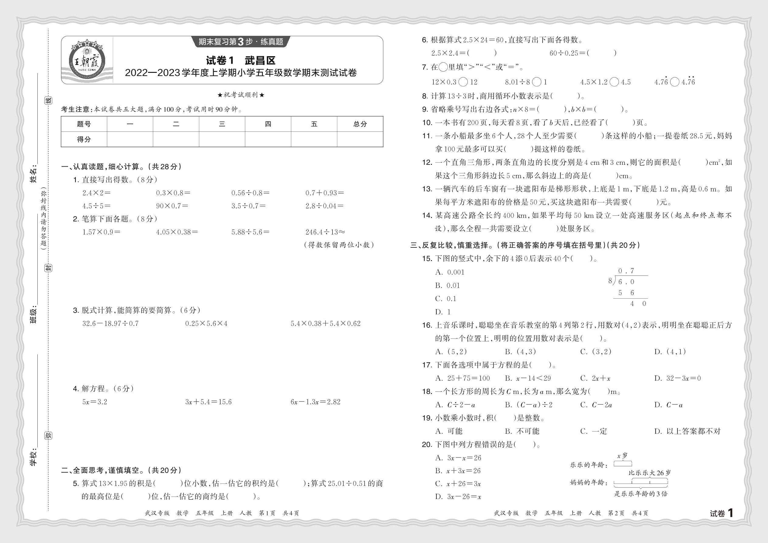 湖北省武汉市武昌区2022—2023学年度上学期小学五年级数学期末测试试卷(人教版)【1】