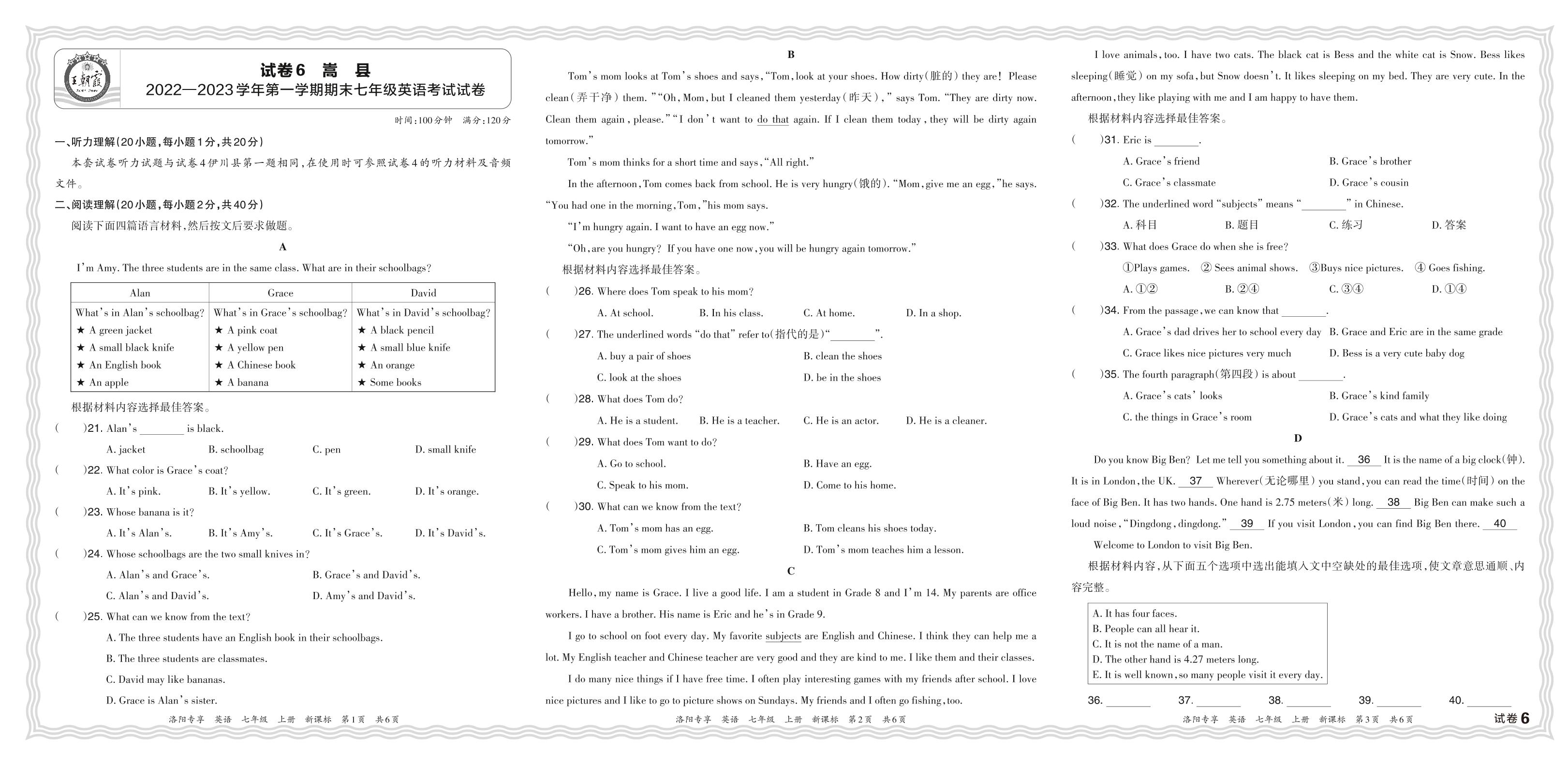 河南省洛阳市嵩县2022—2023学年第一学期期末七年级英语考试试卷(新课标版)【6】