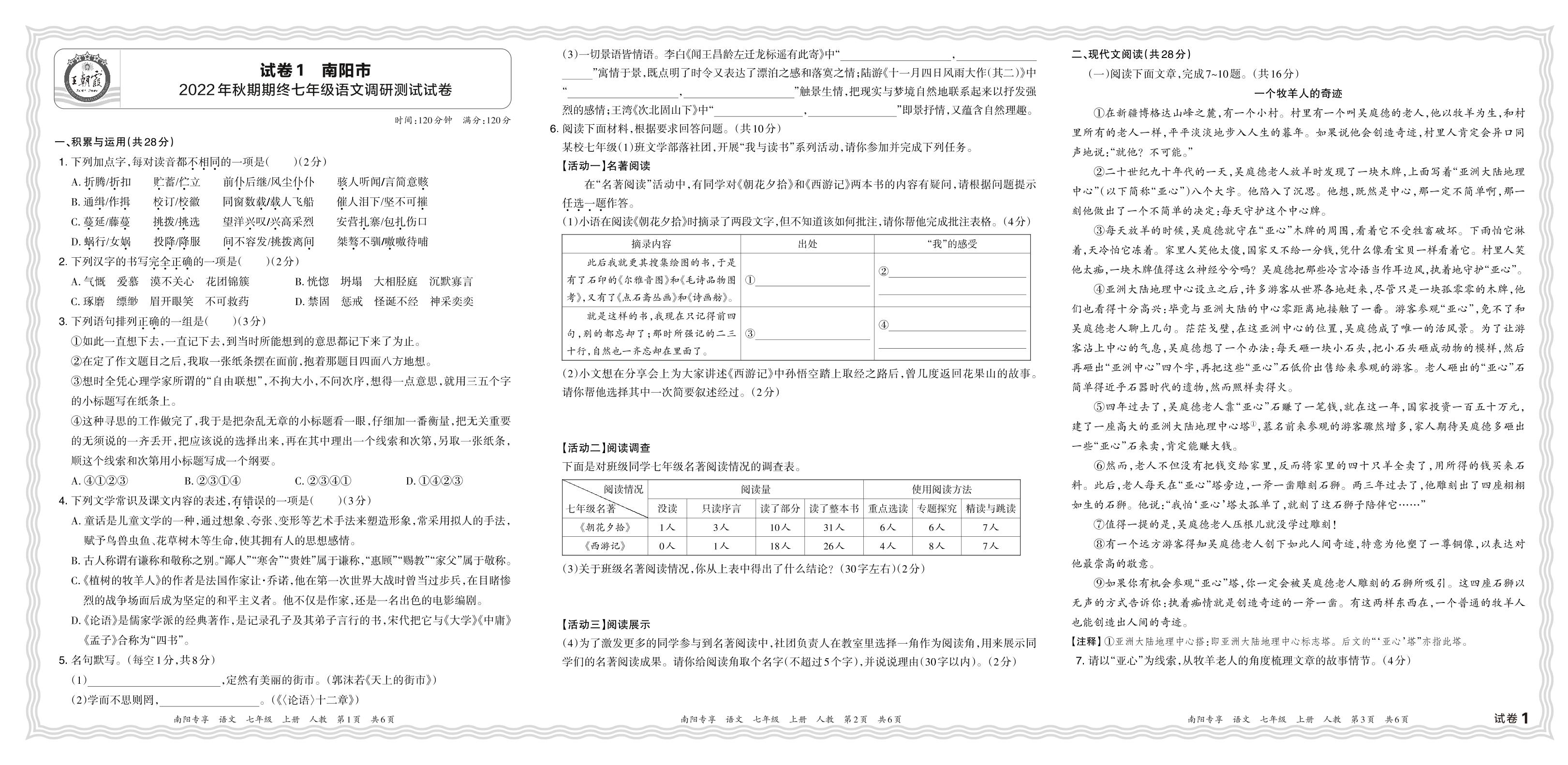 河南省南阳市2022年秋期期终七年级语文调研测试试卷(人教版)【1】