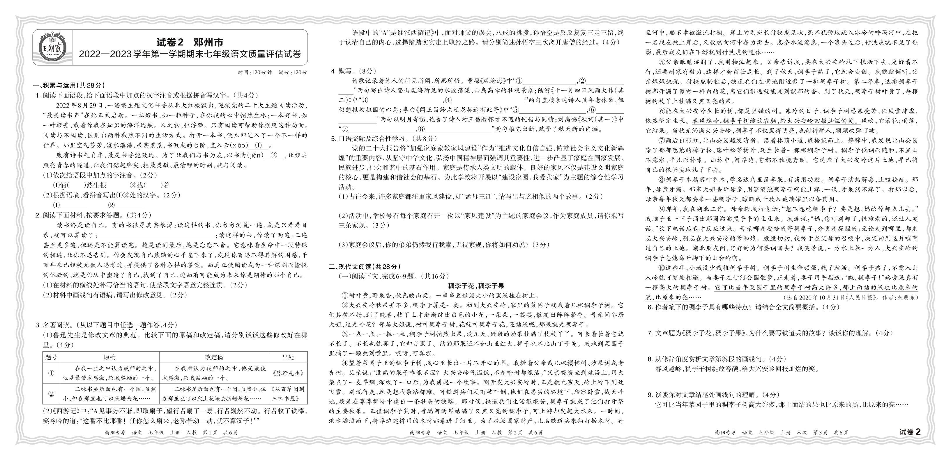 河南省南阳市邓州市2022—2023学年第一学期期末七年级语文质量评估试卷(人教版)【2】
