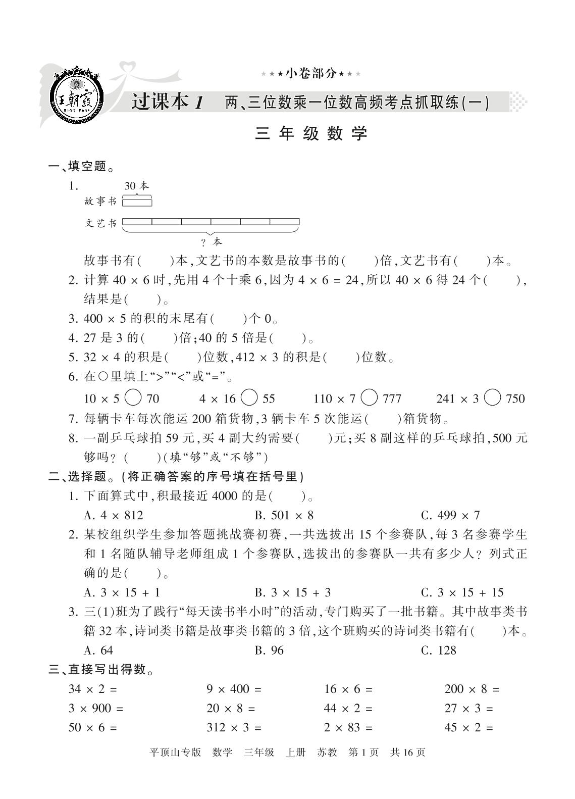 三年级数学苏教版上册过课本