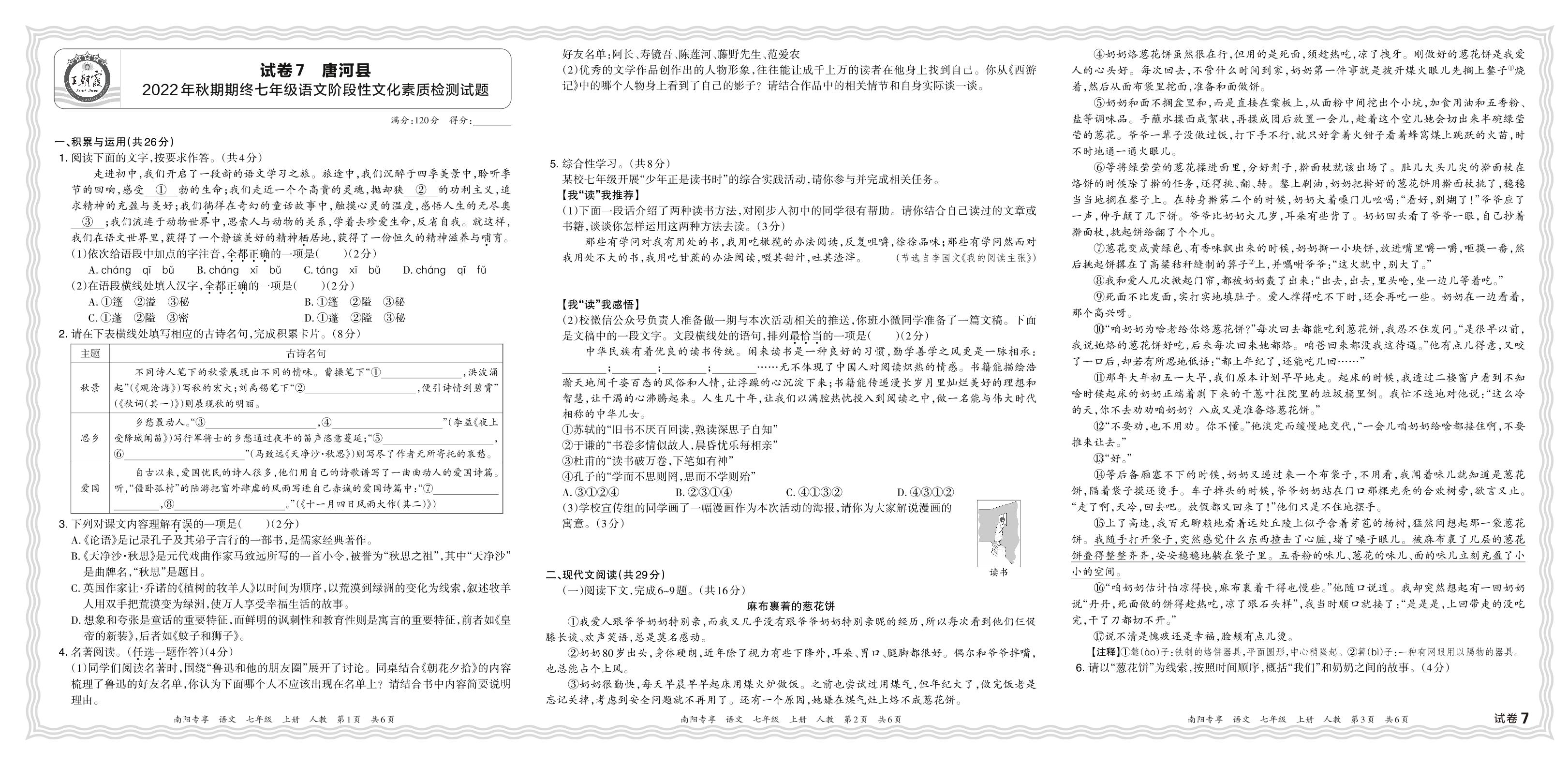 河南省南阳市唐河县2022年秋期期终七年级语文阶段性文化素质检测试题(人教版)【7】