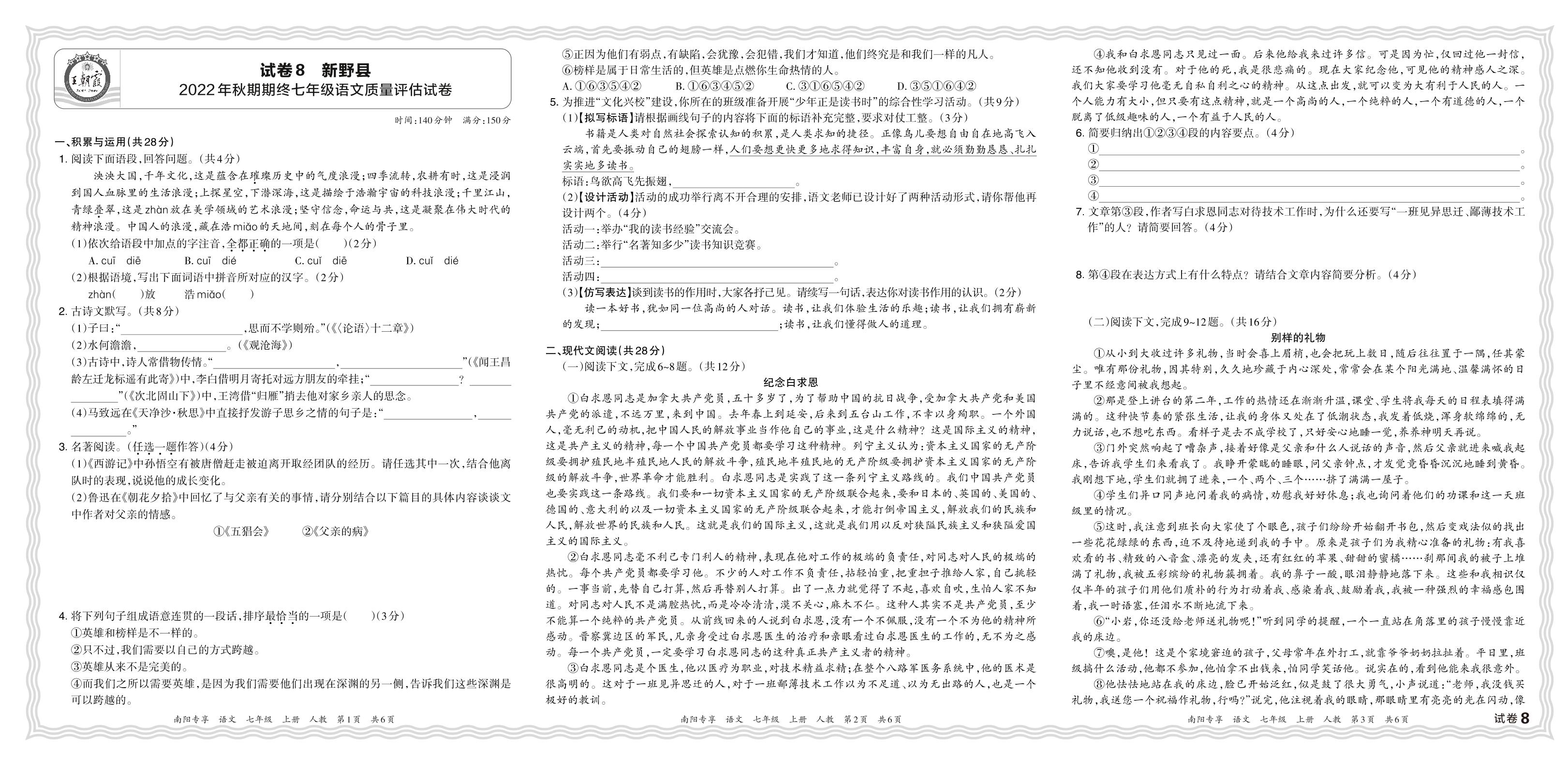 河南省南阳市新野县2022年秋期期终七年级语文质量评估试卷(人教版)【8】