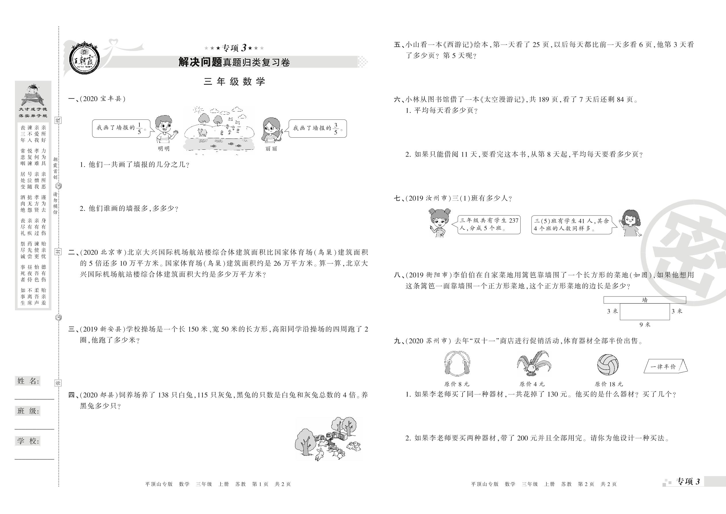 王朝霞期末专项卷——解决问题真题归类复习、新颖题速递:生活与数学三年级上册数学(苏教版)_R21080490846【0】