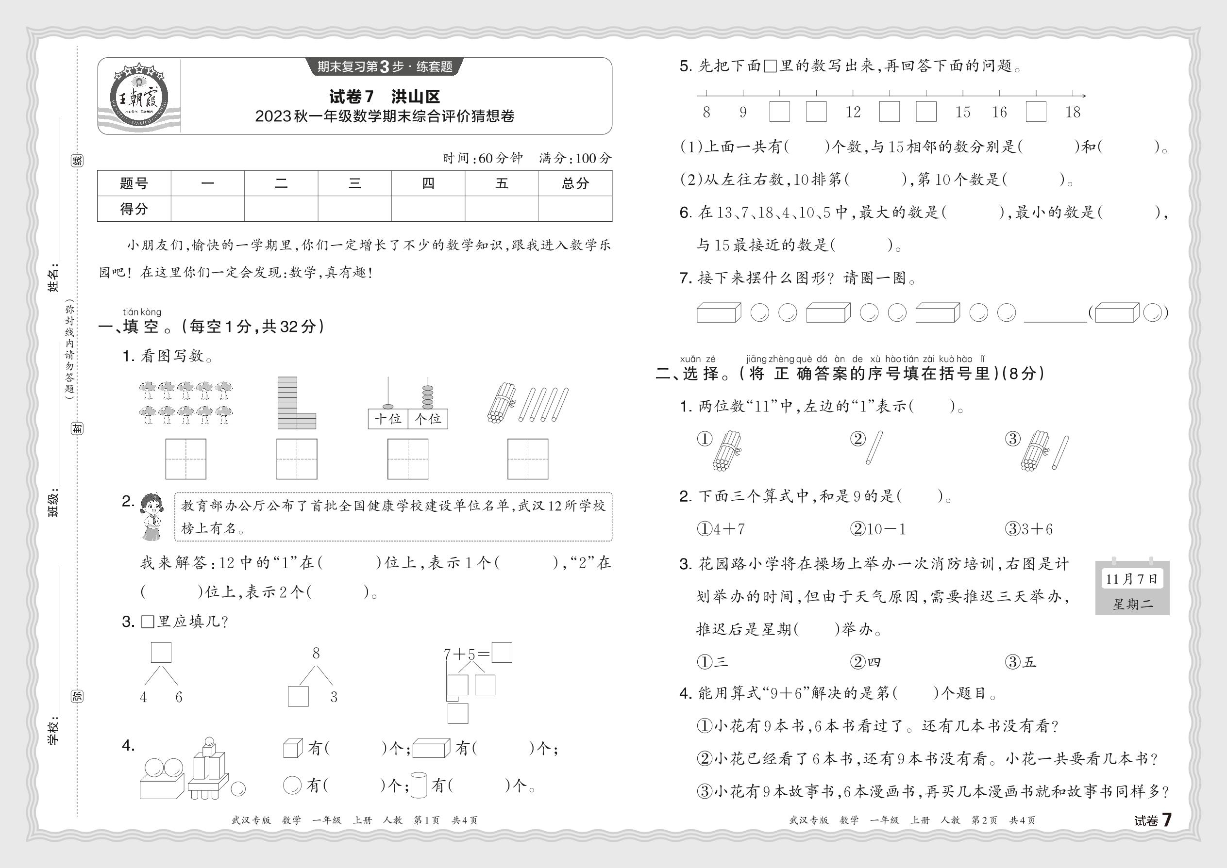 湖北省武汉市洪山区2023秋一年级数学期末综合评价猜想卷(人教版)【7】