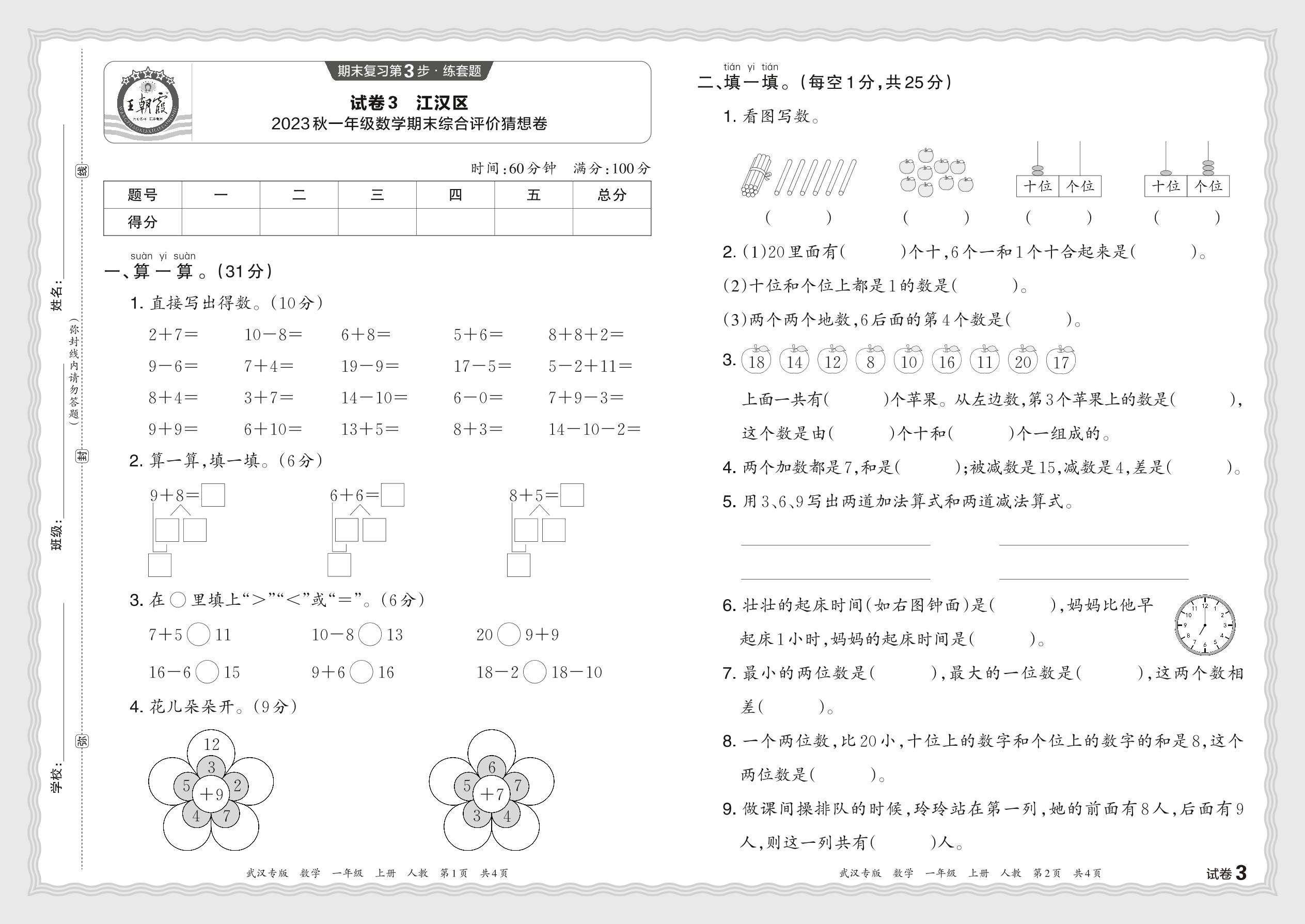 湖北省武汉市江汉区2023秋一年级数学期末综合评价猜想卷(人教版)【3】