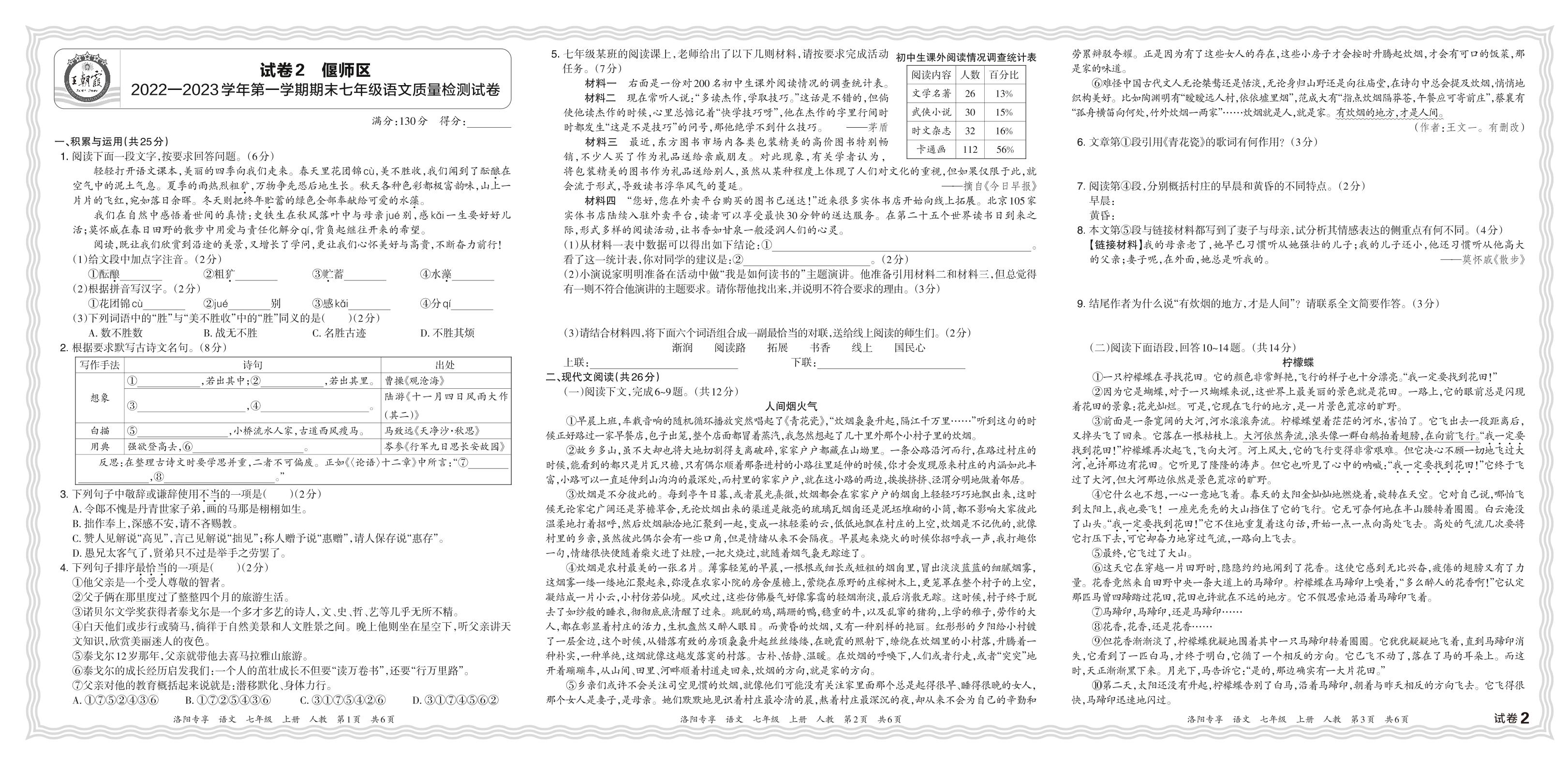 河南省洛阳市偃师区2022—2023学年第一学期期末七年级语文质量检测试卷(人教版)【2】