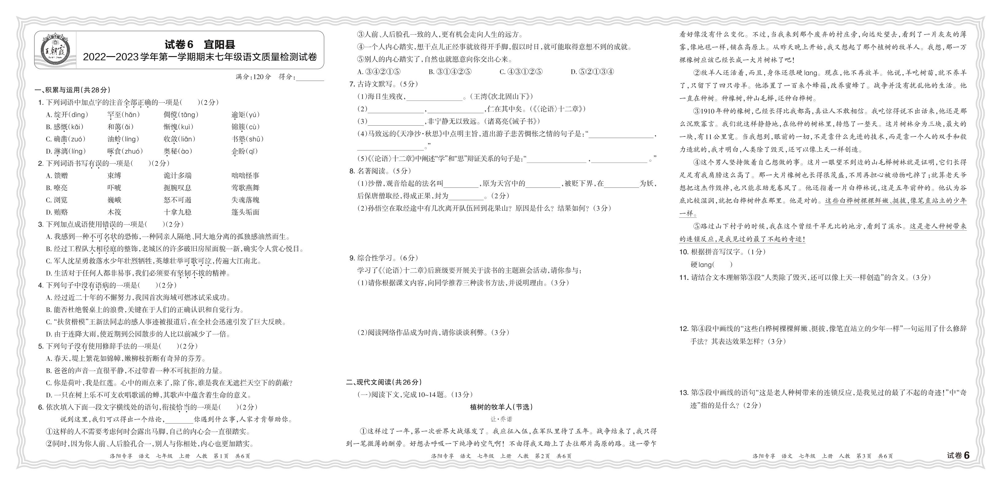 河南省洛阳市宜阳县2022—2023学年第一学期期末七年级语文质量检测试卷(人教版)【6】