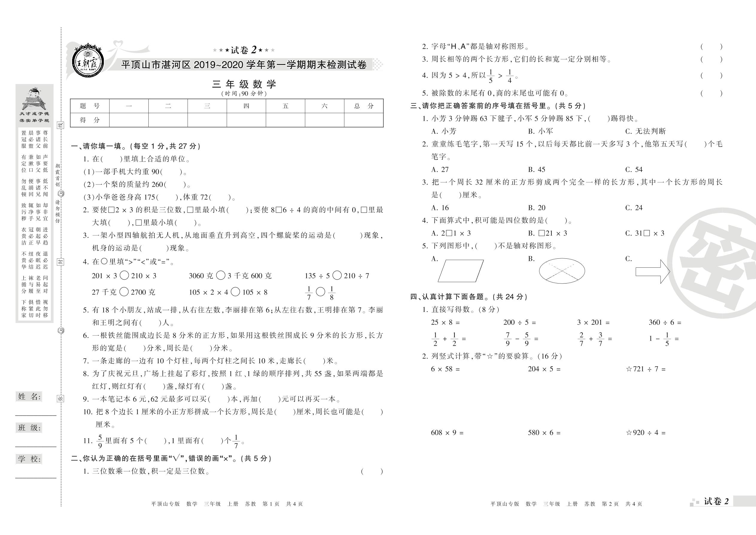 2019-2020学年第一学期平顶山市湛河区三年级数学试卷(苏教版)【2】