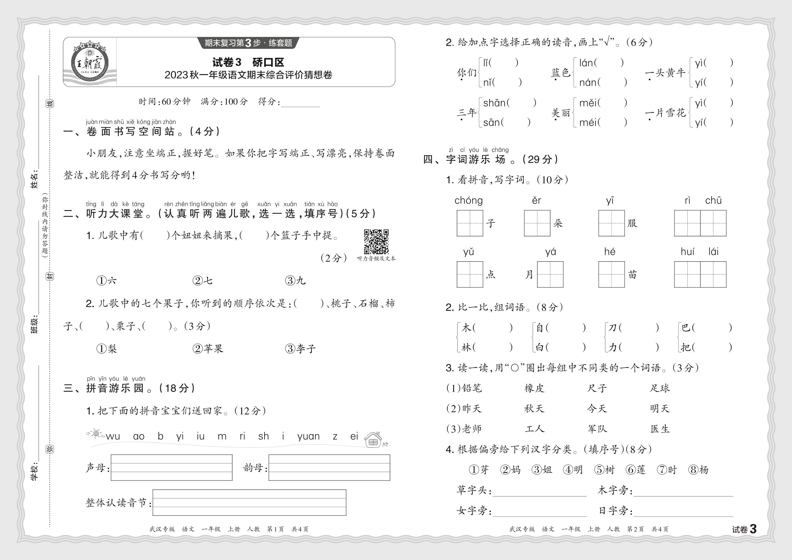 湖北省武汉市硚口区2023秋一年级语文期末综合评价猜想卷(人教版)【3】