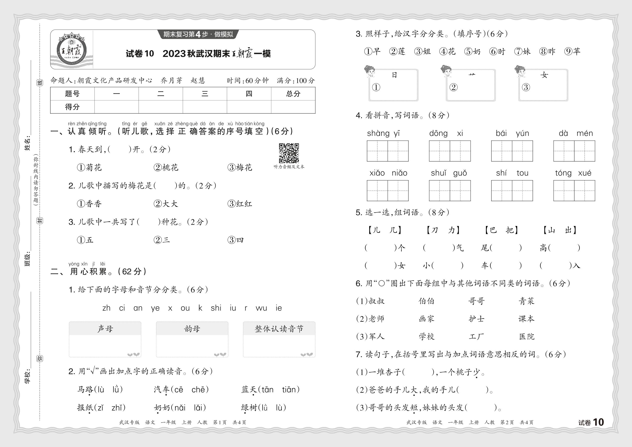 2023秋上册一年级语文人教版 湖北武汉期末王朝霞一模