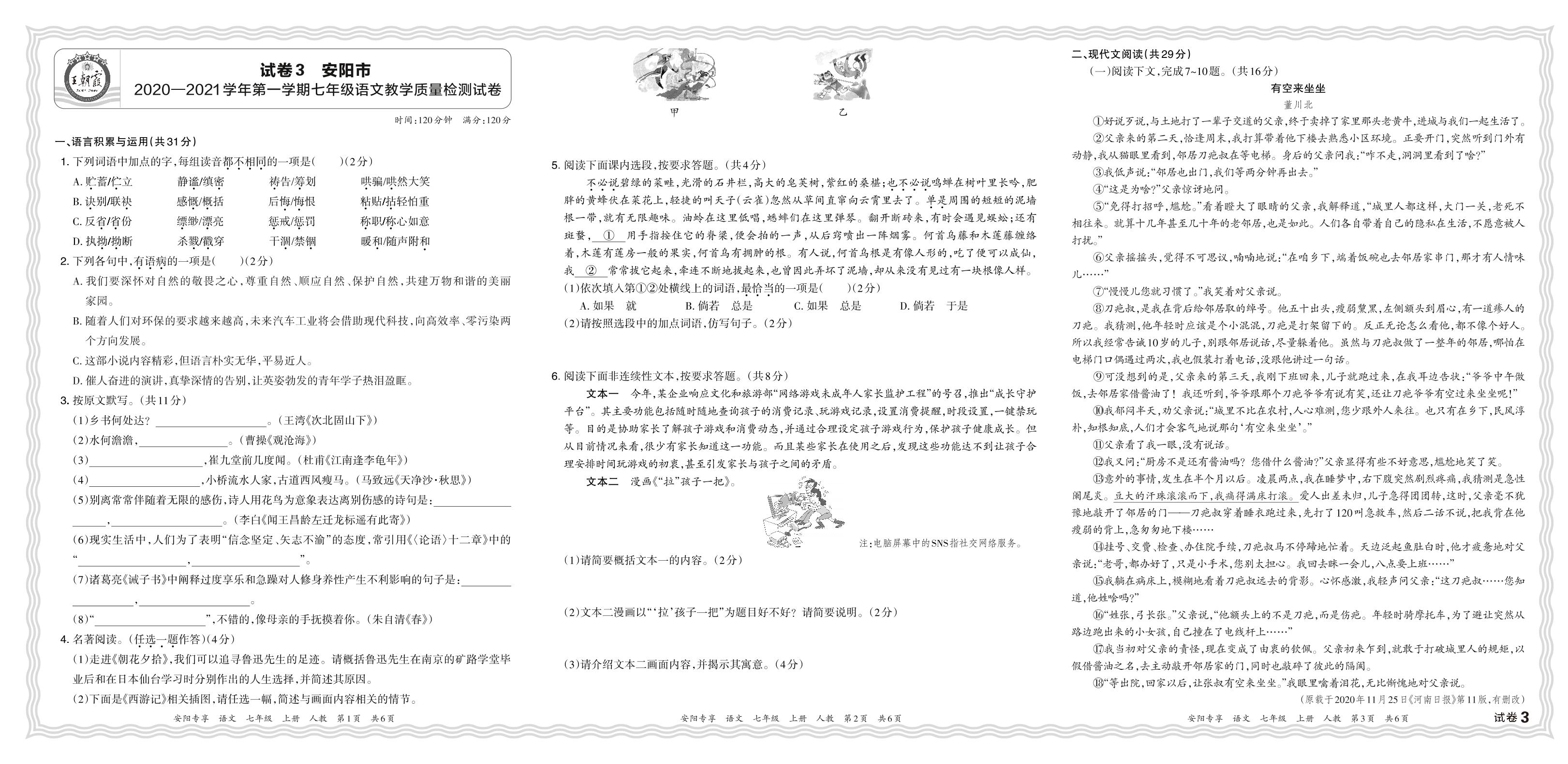 河南省安阳市2020—2021学年第一学期七年级语文教学质量检测试卷(人教版)【3】