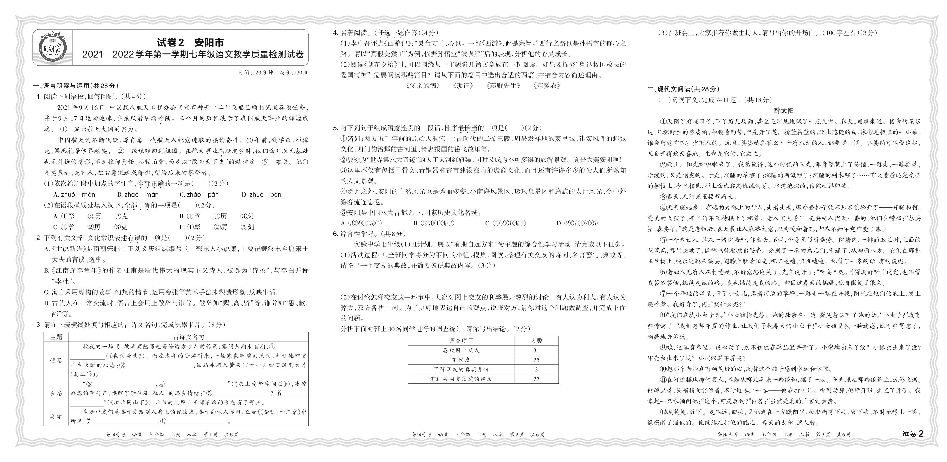 河南省安阳市2021—2022学年第一学期七年级语文教学质量检测试卷(人教版)【2】