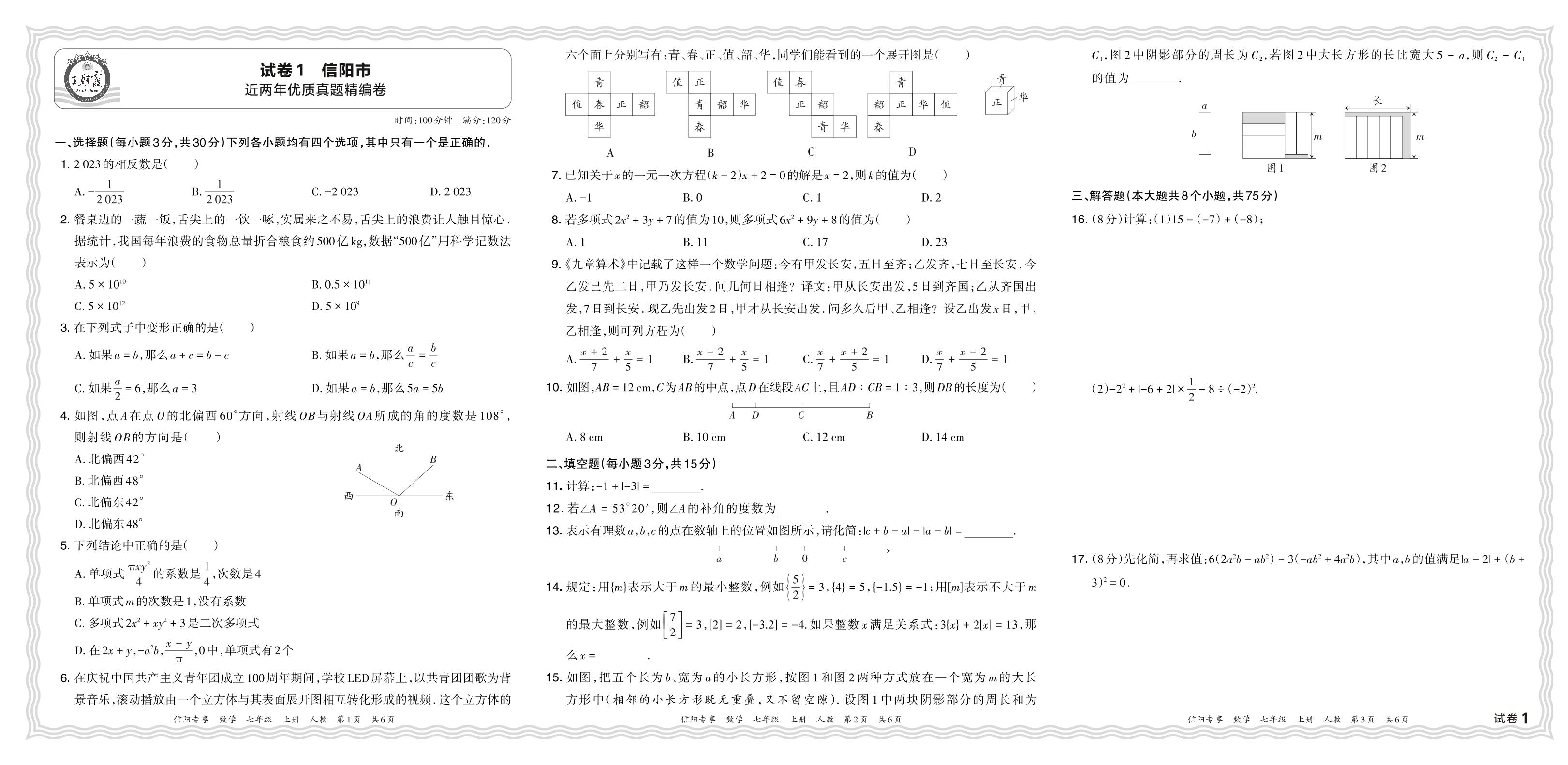 2023年秋河南省信阳市近两年优质真题精编卷七年级上册期末数学(人教版)【1】