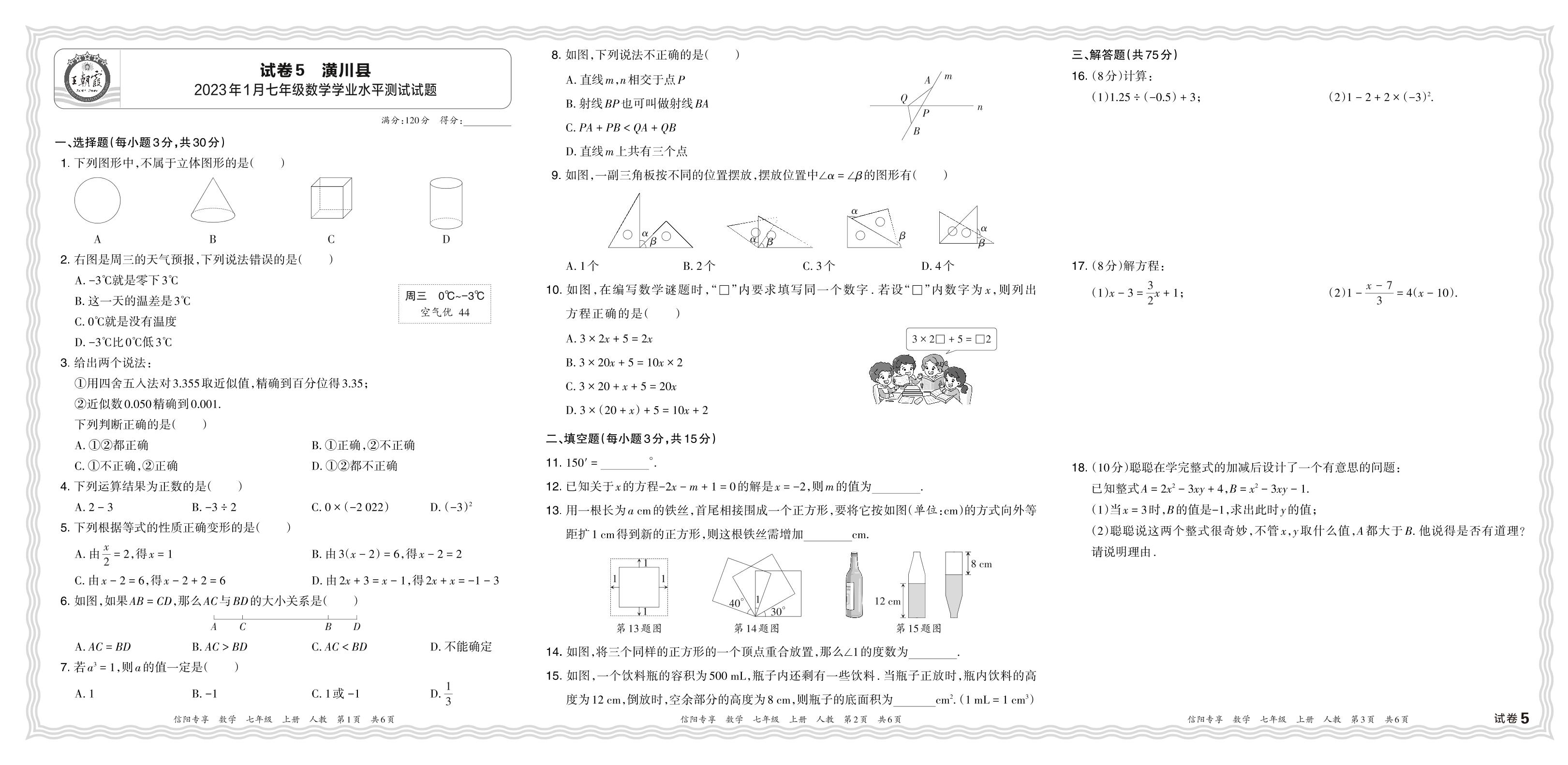 河南省信阳市潢川县2023年1月七年级数学学业水平测试试题(人教版)【5】