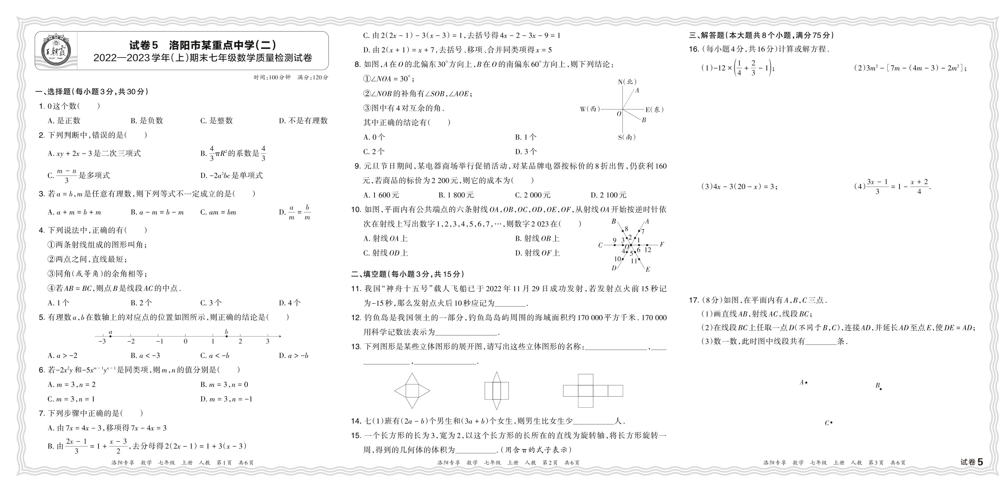 河南省洛阳市某重点中学(二)2022—2023学年(上)期末七年级数学质量检测试卷(人教版)【5】
