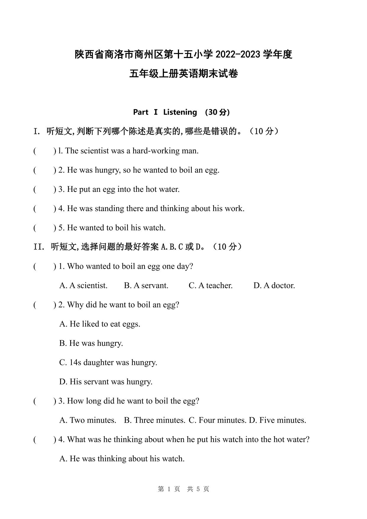 陕西省商洛市商州区第十五小学2022-2023学年度第一学期期末测试卷五年级英语(陕旅版)【无听力音频】