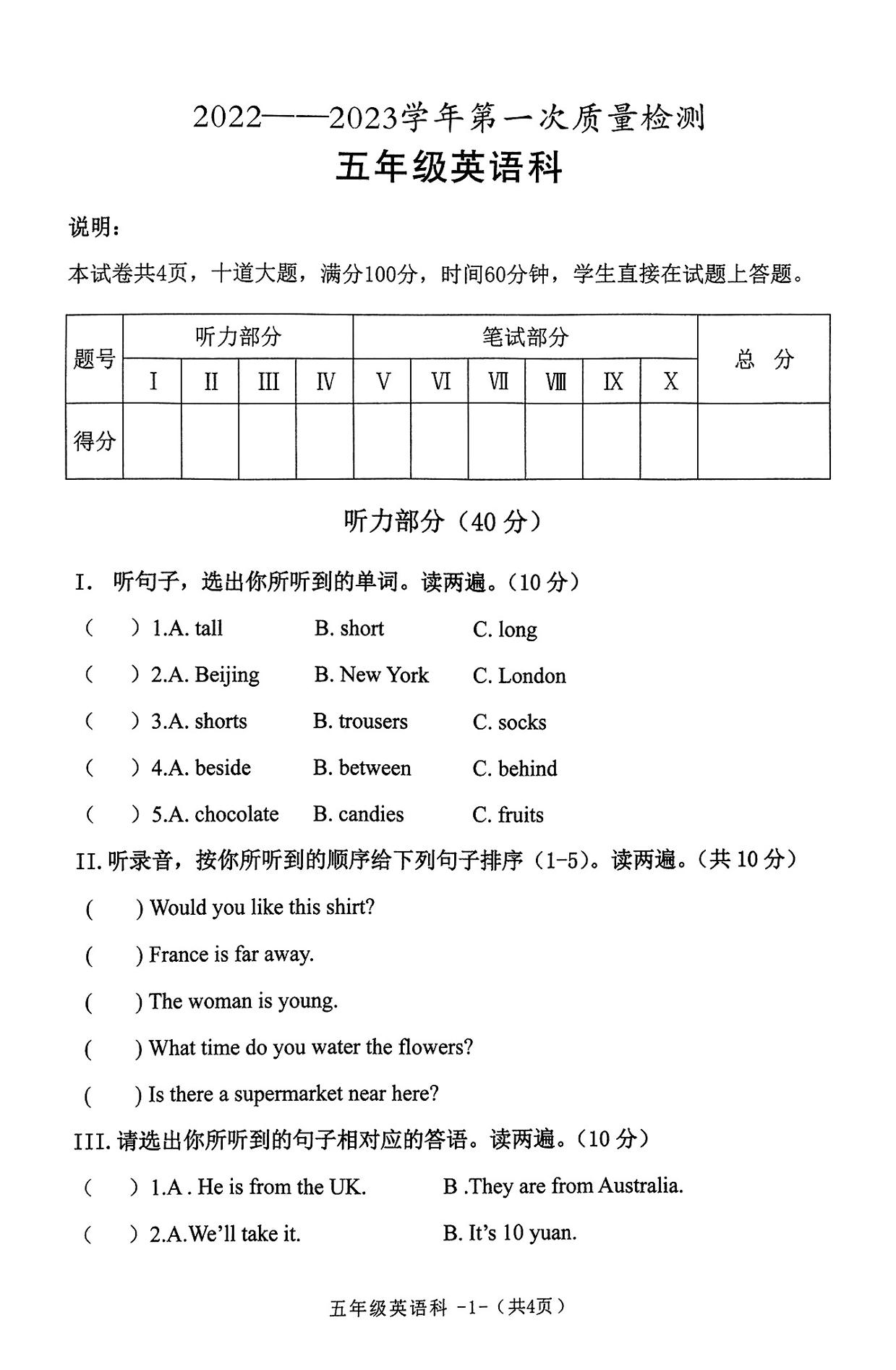 陕西省咸阳市泾阳县2022-2023学年上学期第一次质量检测五年级英语(陕旅版)【无听力音频】