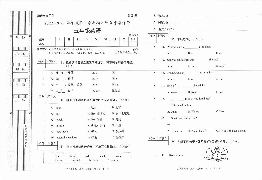 陕西省延安市富县2022-2023学年度第一学期期末综合素素质评价五年级英语(陕旅版)【无听力音频】