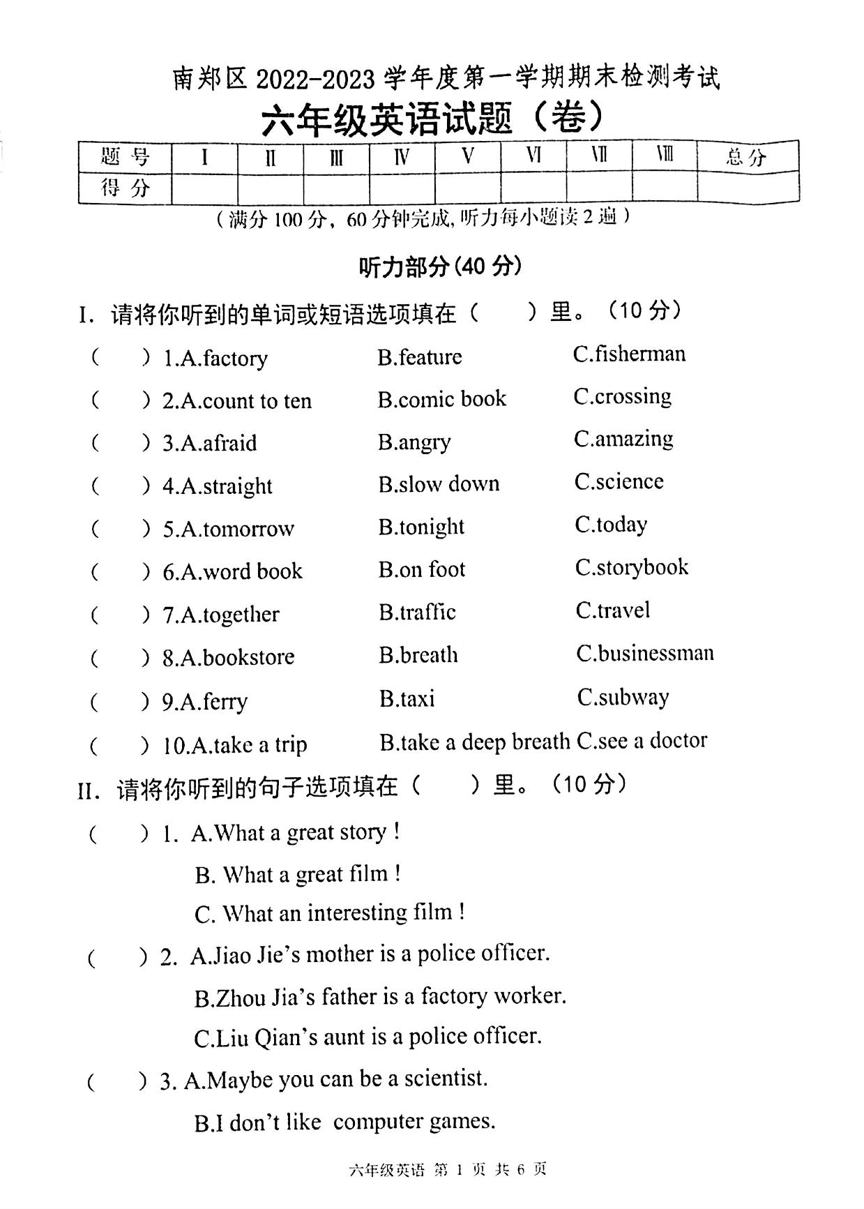 陕西省汉中市南郑区2022-2023学年度第一学期期末检测考试试题卷六年级英语(人教PEP版)【无听力音频】