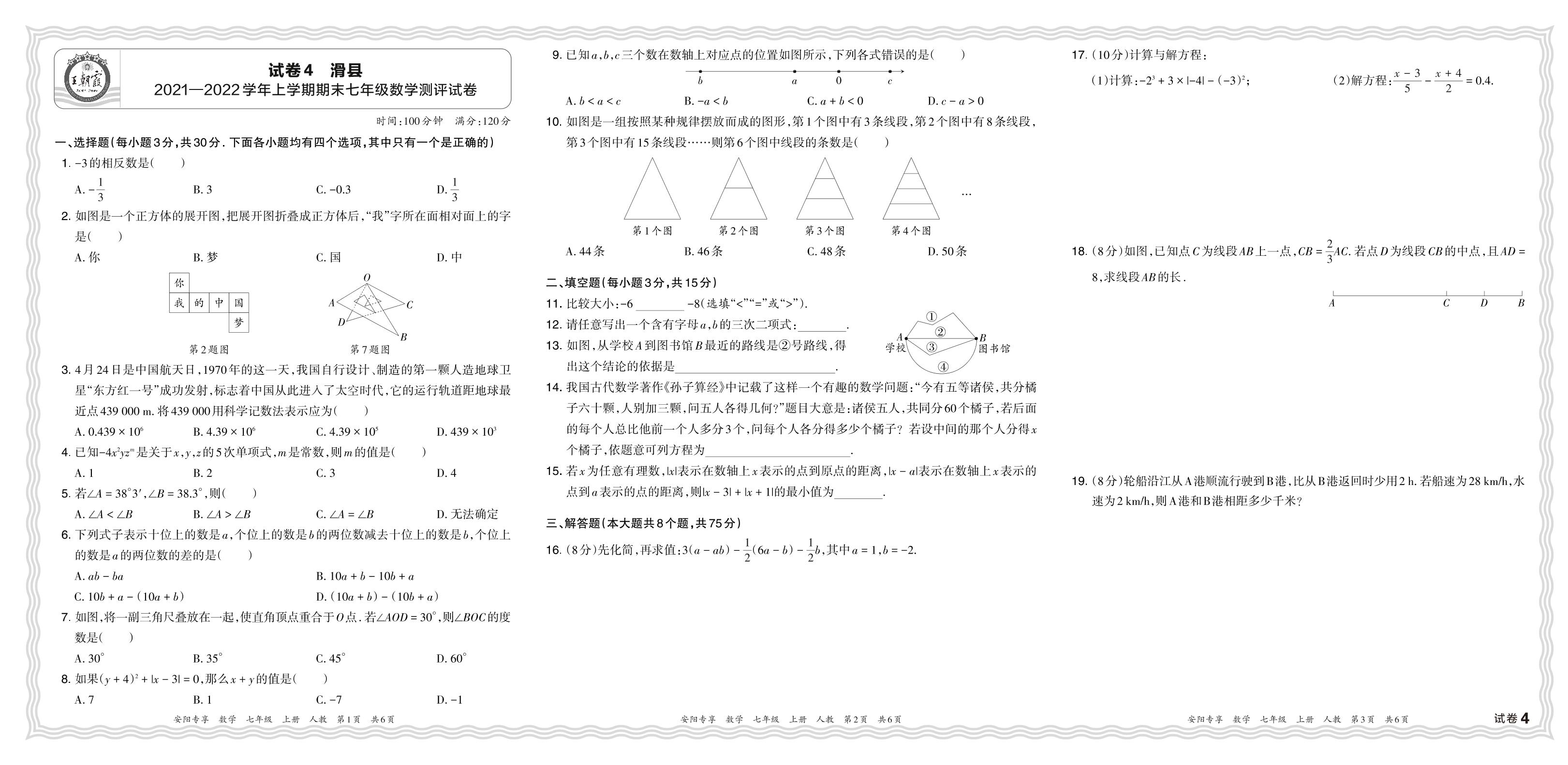 河南省安阳市滑县2021—2022学年上学期期末七年级数学测评试卷(人教版)【4】