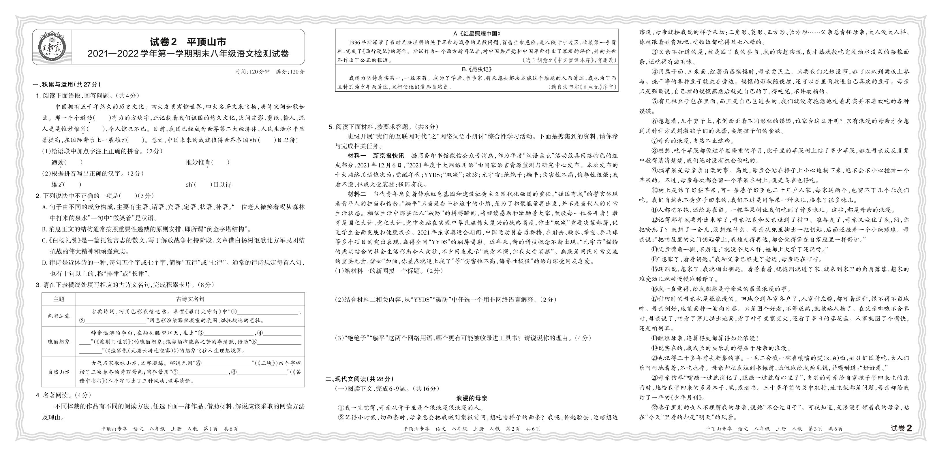河南省平顶山市2021—2022学年第一学期期末八年级语文检测试卷(人教版)【2】