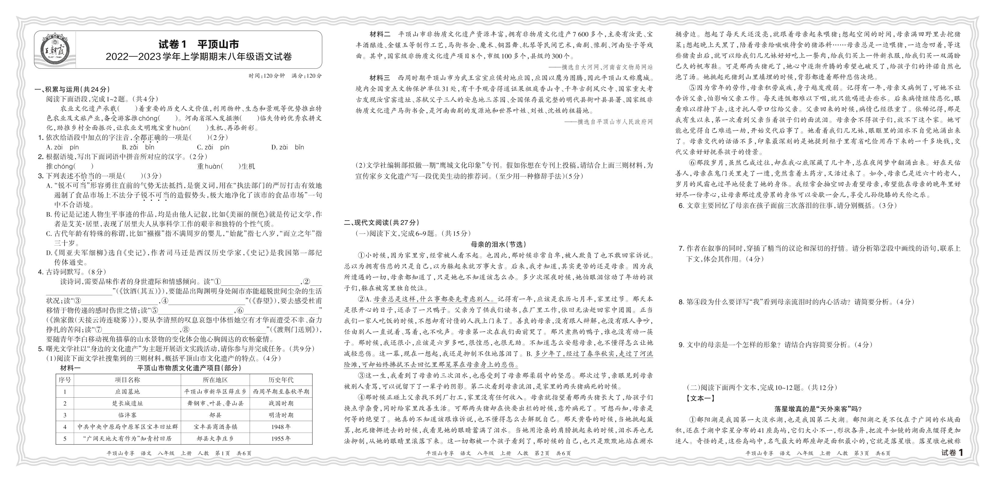 河南省平顶山市2022—2023学年上学期期末八年级语文试卷(人教版)【1】