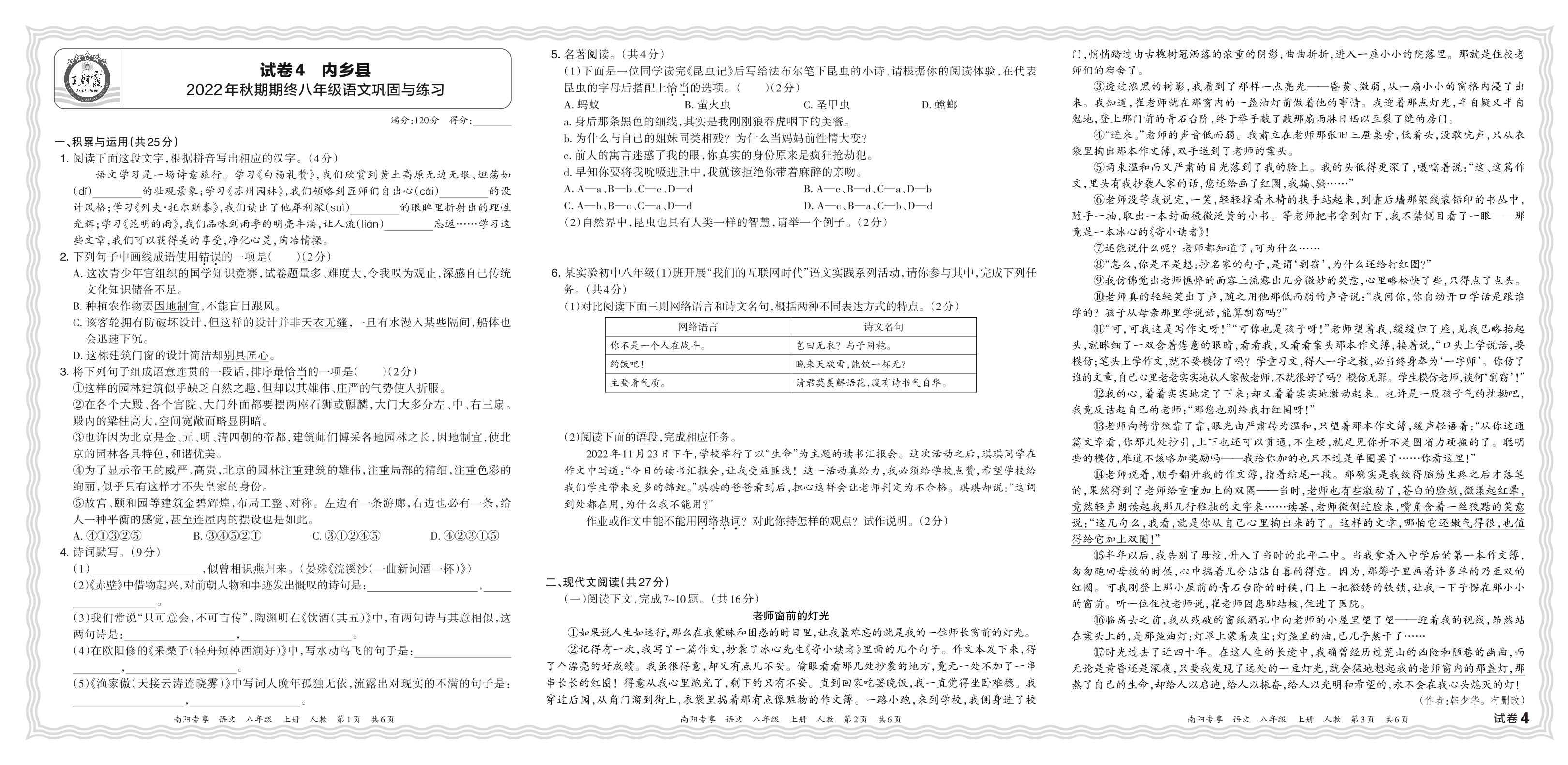 河南省南阳市内乡县2022年秋期期终八年级语文巩固与练习(人教版)【4】