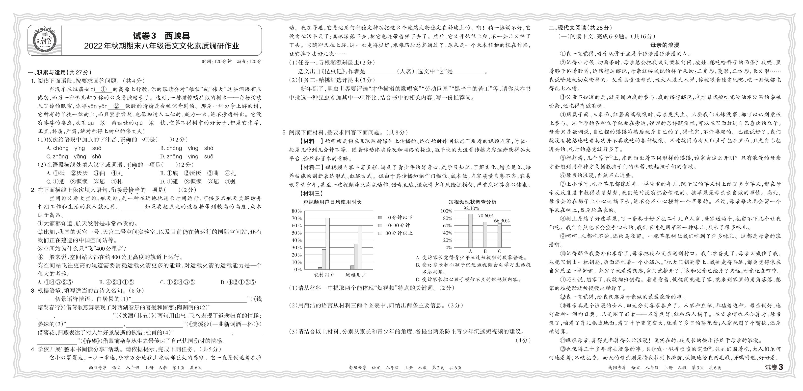 河南省南阳市西峡县2022年秋期期末八年级语文文化素质调研作业(人教版)【3】