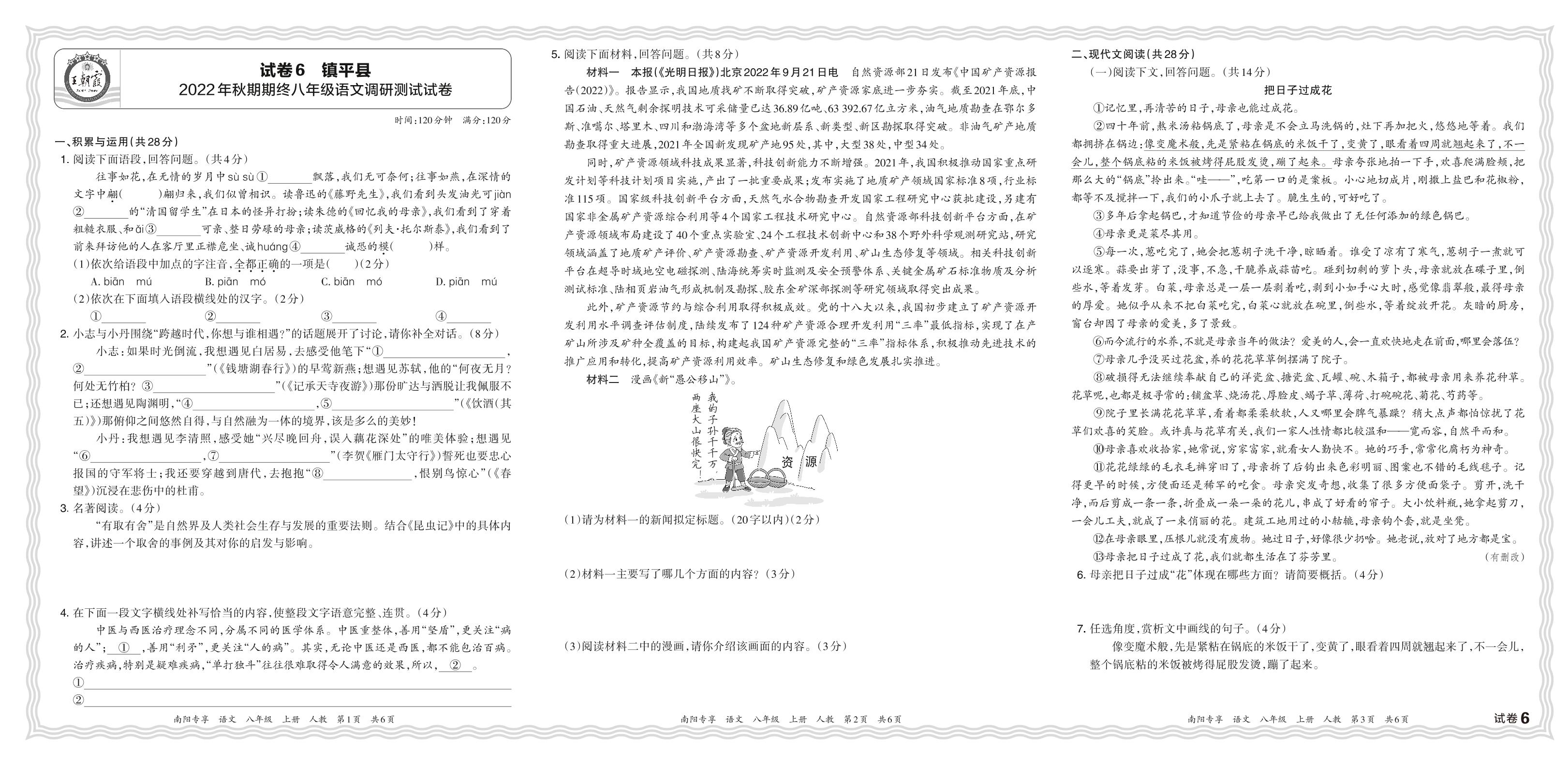 河南省南阳市镇平县2022年秋期期终八年级语文调研测试试卷(人教版)【6】