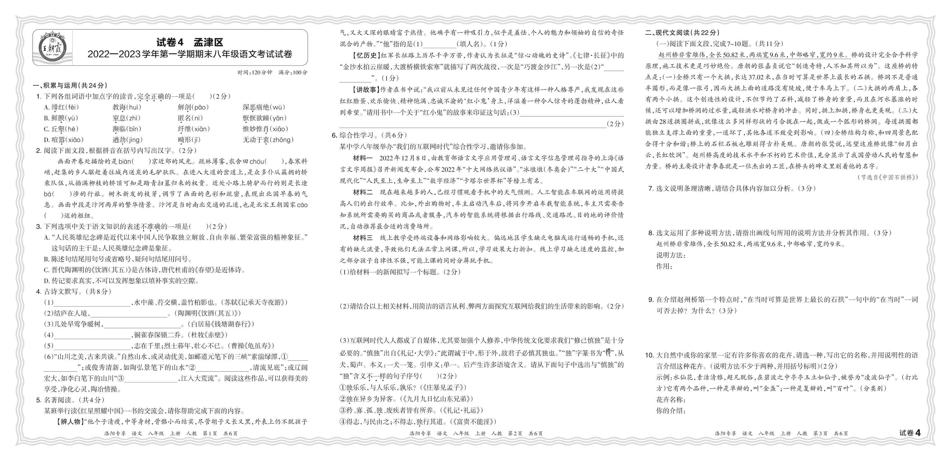 河南省洛阳市孟津区2022—2023学年第一学期期末八年级语文考试试卷(人教版)【4】