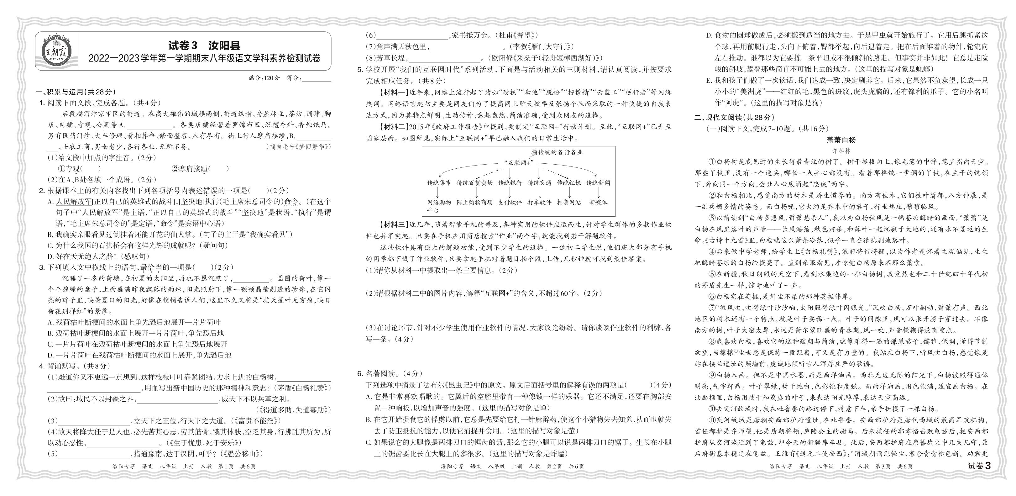 河南省洛阳市汝阳县2022—2023学年第一学期期末八年级语文学科素养检测试卷(人教版)【3】