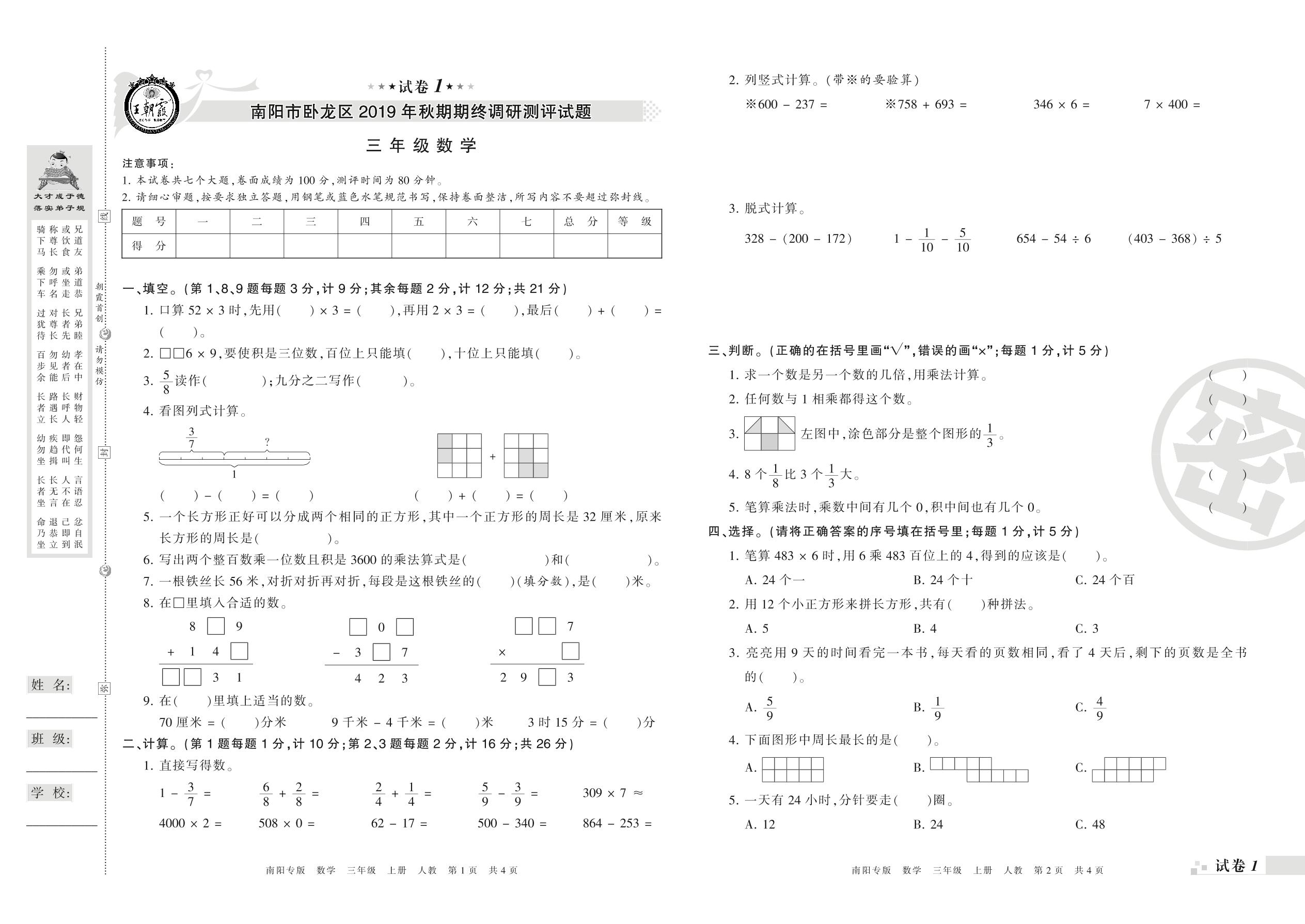 2019-2020学年第一学期南阳市卧龙区三年级数学试卷(人教版)【1】
