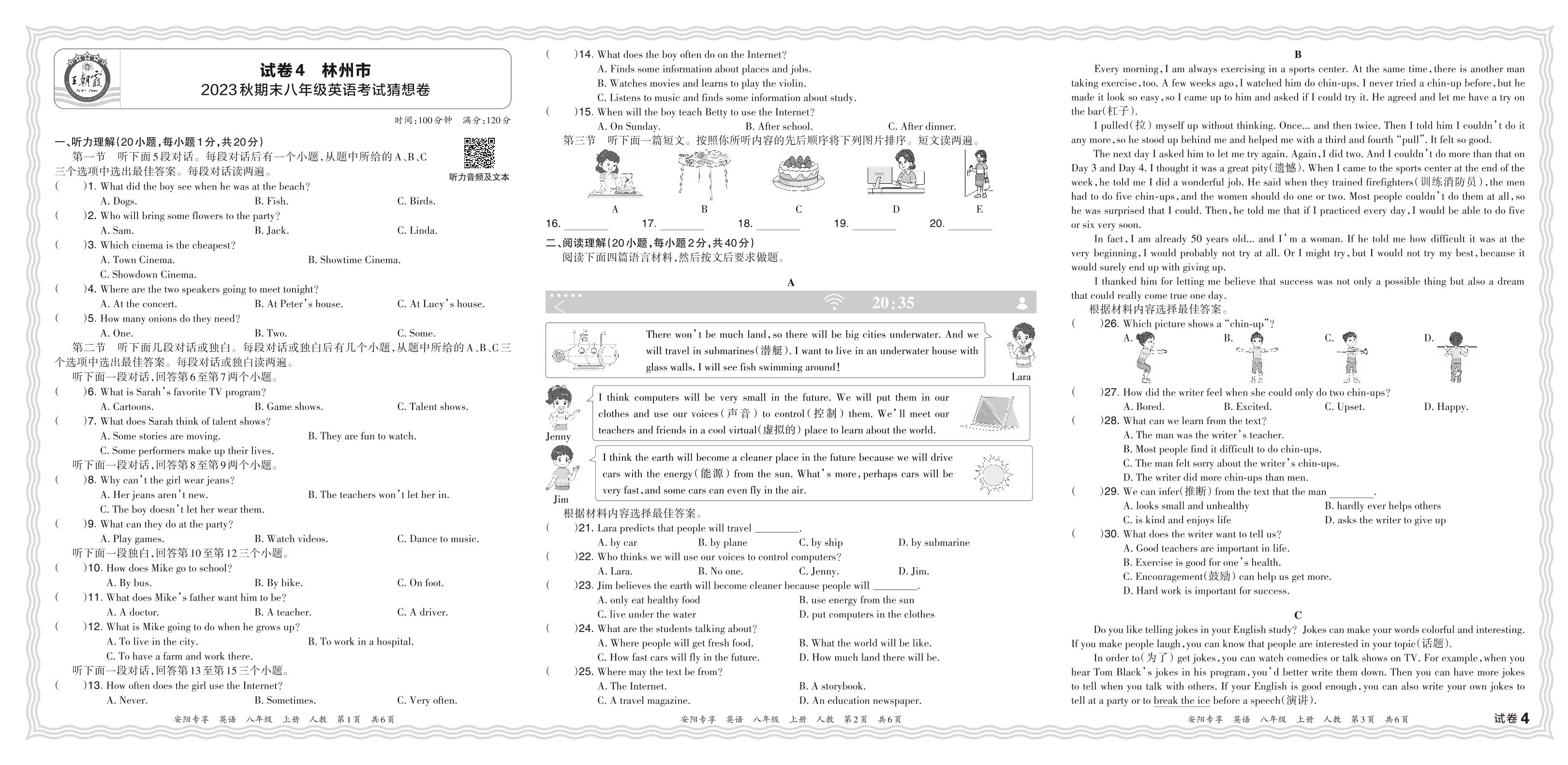 河南省安阳市林州市2023秋期末八年级英语考试猜想卷(人教版)【4】