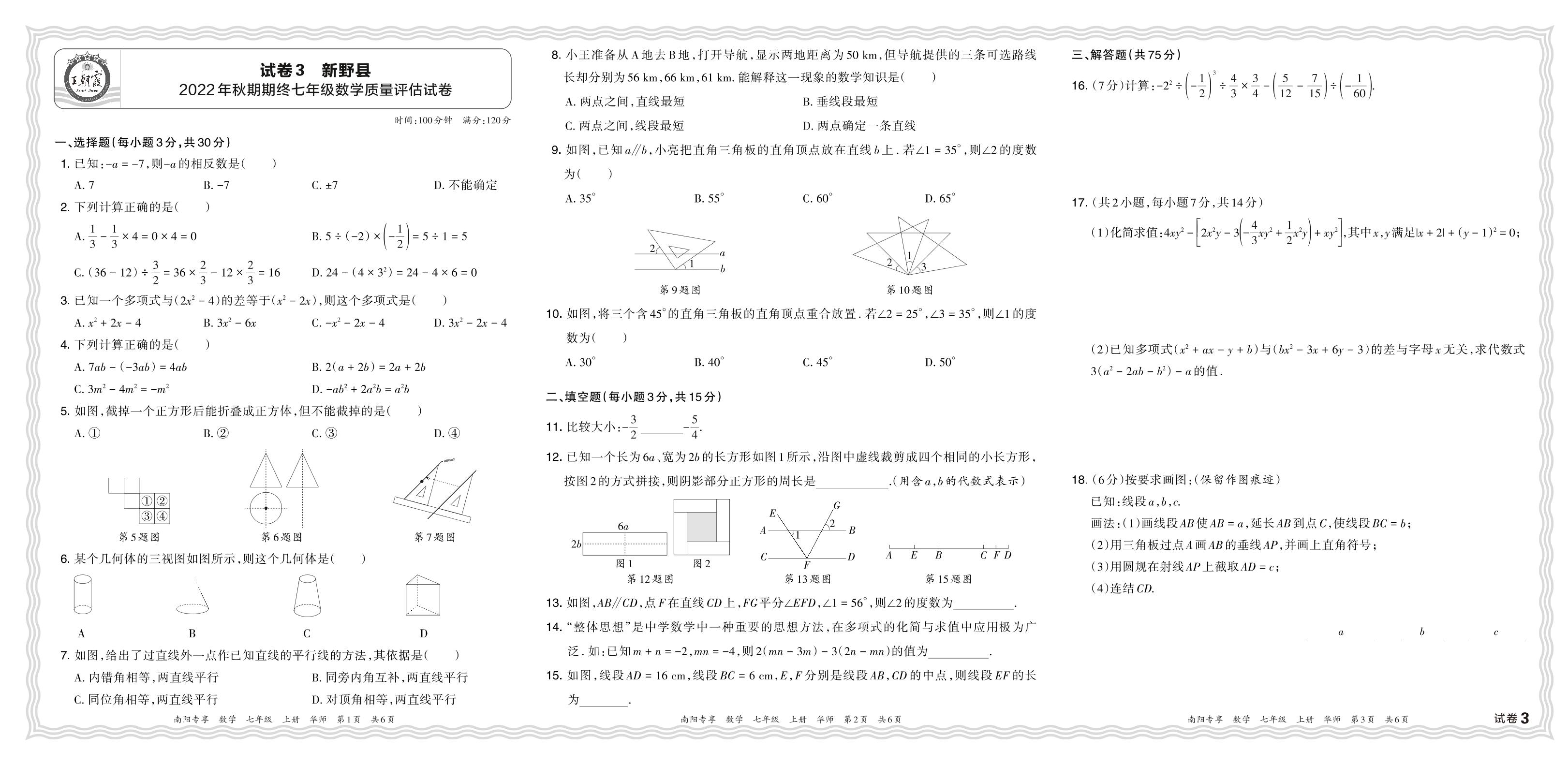 河南省南阳市新野县2022年秋期期终七年级数学质量评估试卷(华师版)【3】