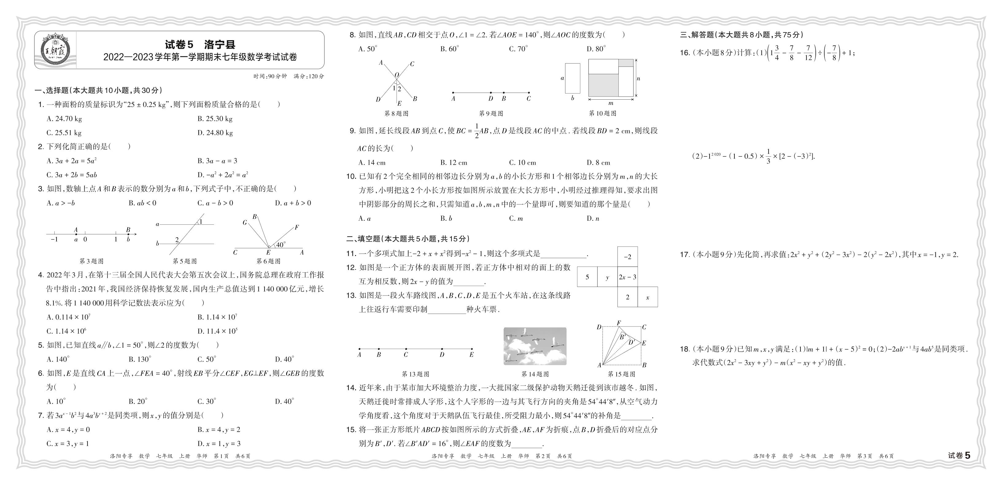 河南省洛阳市洛宁县2022—2023学年第一学期期末七年级数学考试试卷(华师版)【5】