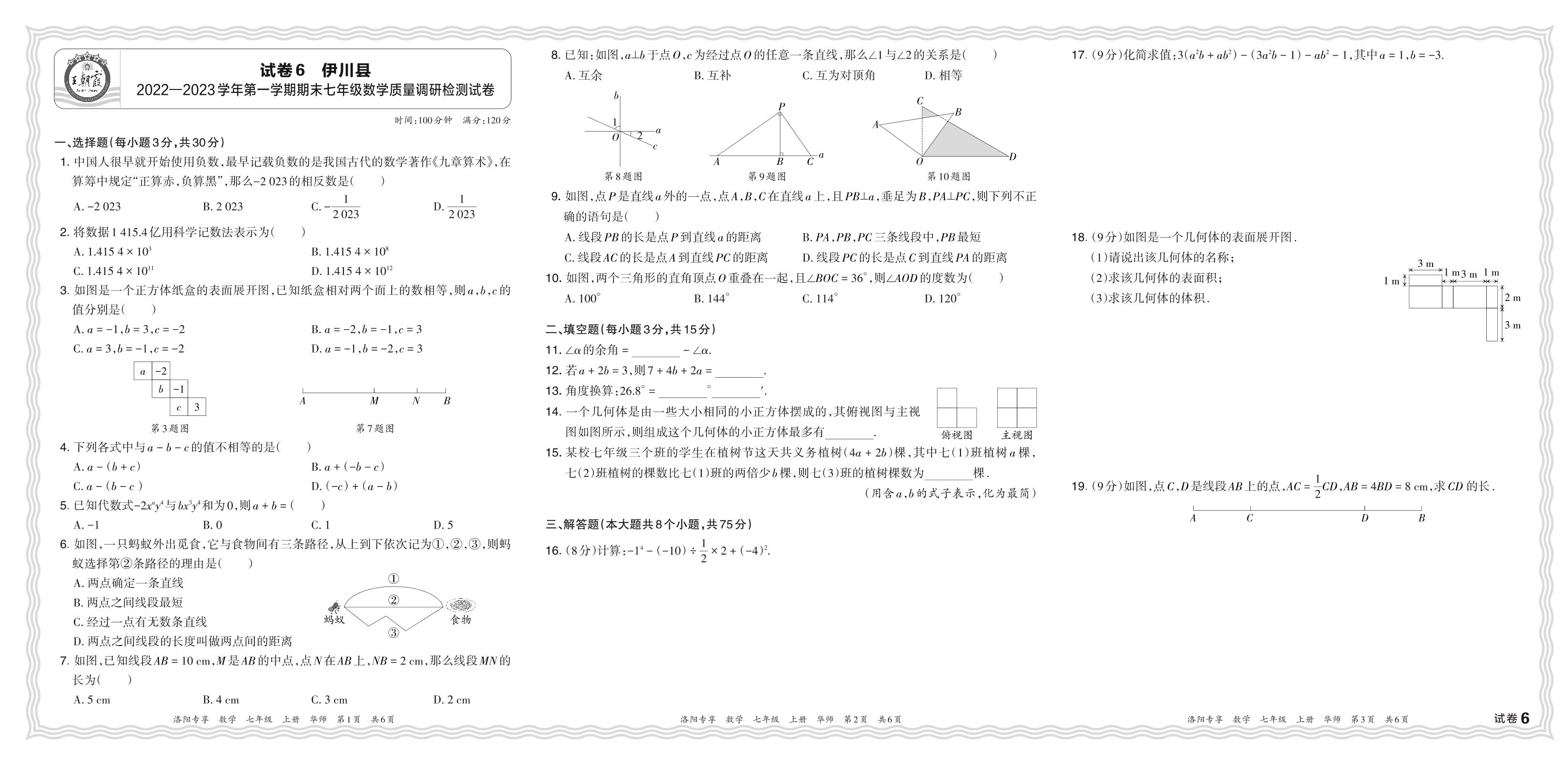 河南省洛阳市伊川县2022—2023学年第一学期期末七年级数学质量调研检测试卷(华师版)【6】