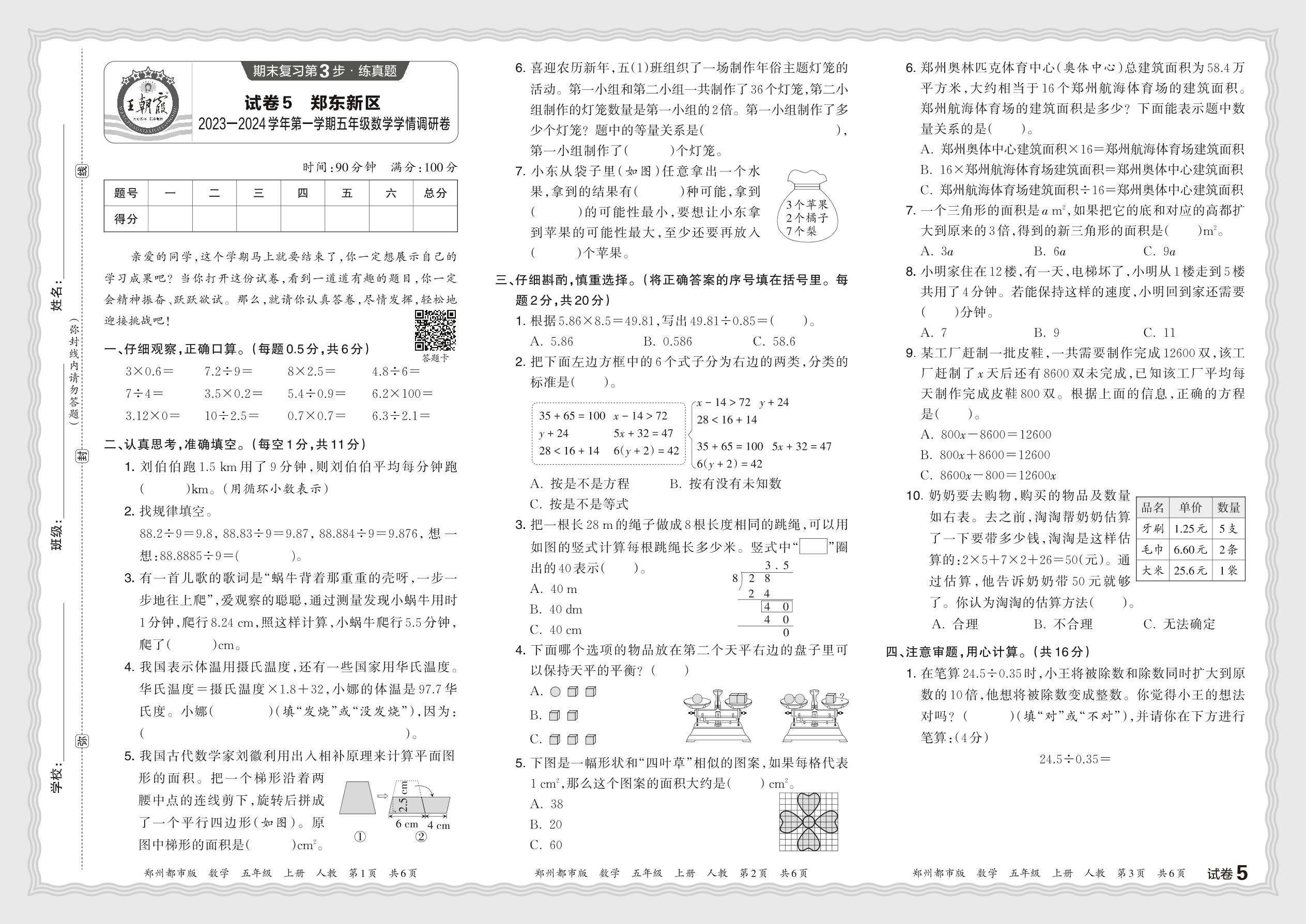 河南省郑州市郑东新区2023—2024学年第一学期五年级数学学情调研卷(人教版)【5】