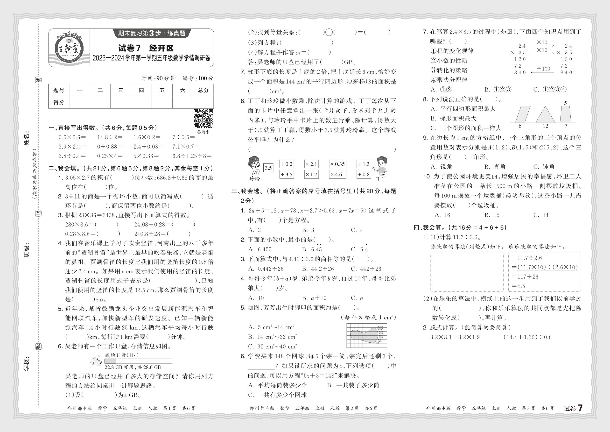 河南省郑州市经开区2023—2024学年第一学期五年级数学学情调研卷(人教版)【7】